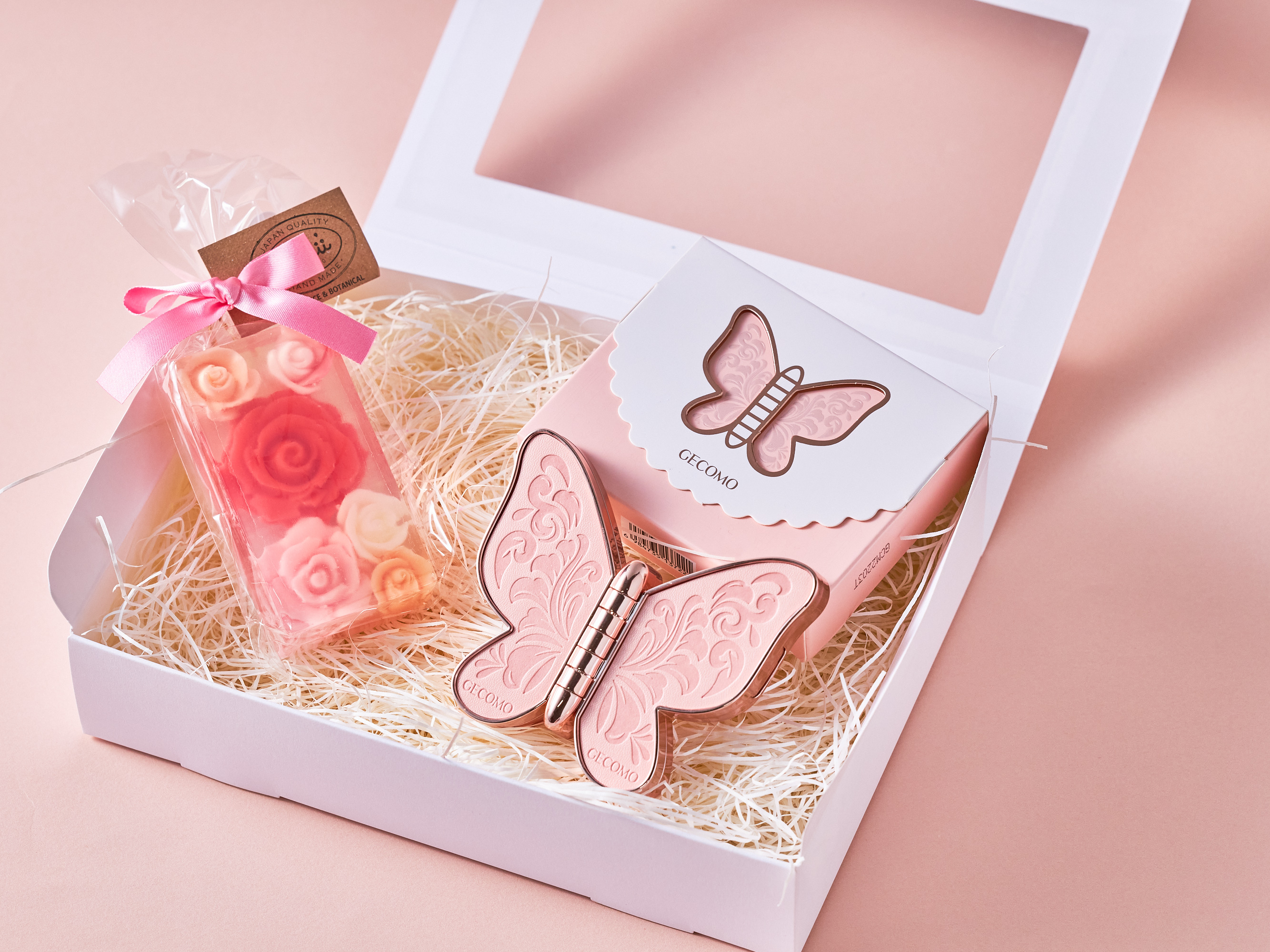 バタフライ型のパッケージがかわいい「GECOMO (ジェコモ)」のアイシャドウパレットとカラフルでポップな花が散りばめられた可愛らしい石鹸をタンプオリジナルギフトボックスに入れてご用意しました。