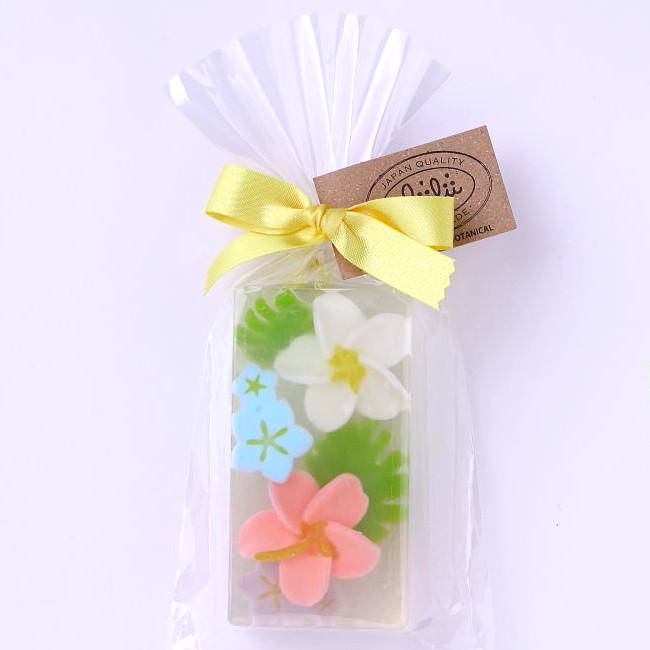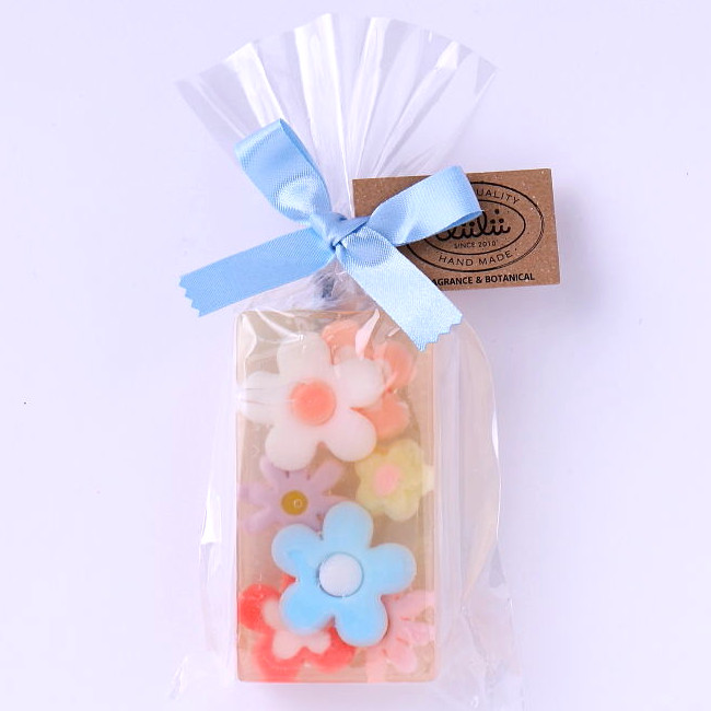 カラフルでポップな花が散りばめられた可愛らしい石鹸。 絶妙なグラデーションは完成して初めて分かります。本物のお花と同じく、一輪ずつ色も濃淡も味わいも全て違います。 一つひとつ手作りで丁寧に作られた、まさにアートな一品は、使ってしまうのがもったいないくらい! ※職人が手作りしているため、お花の色合いや組み合わせは1つ1つ異なります。