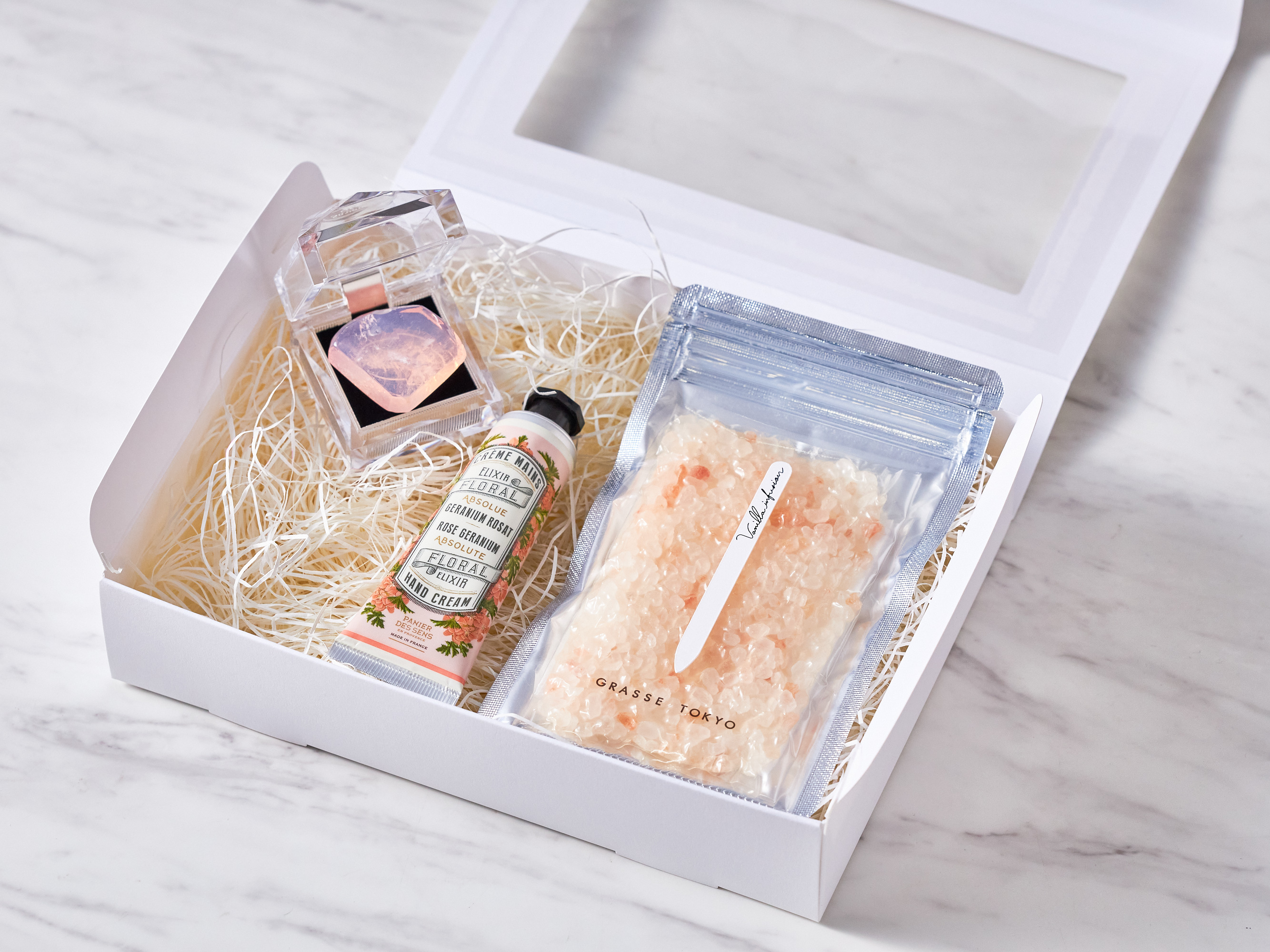ヒマラヤ山脈の麓から採掘され、ミネラルが豊富に含まれたフレグランスソルトと香水の様な香りと宝石をモチーフにしたデザインが特徴の「Savons Gemme(サボンジェム)」のベビージェム、ふわっと香りひろがるハンド&ネイルクリームをタンプオリジナルギフトボックスに入れてご用意しました。
