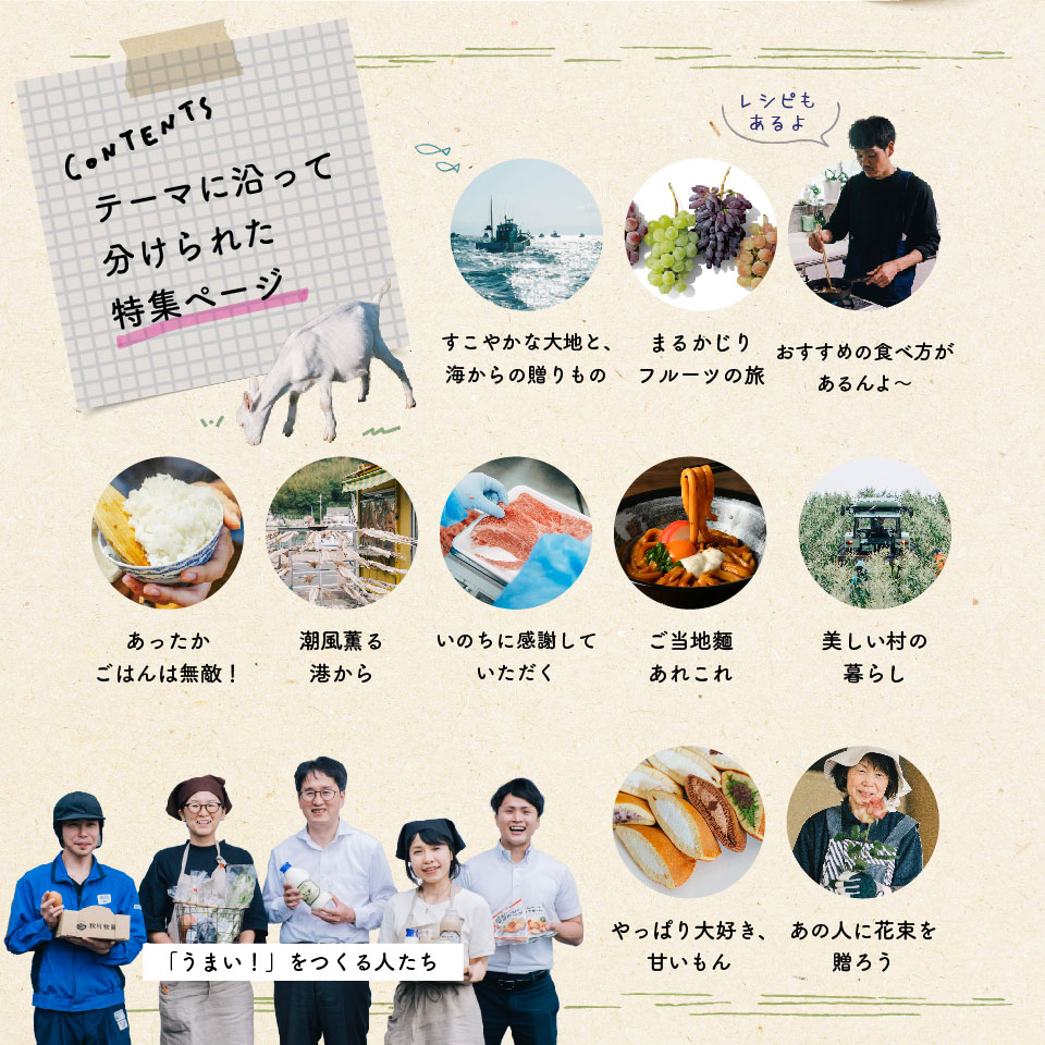 「うましま」では、おいしいの裏側にある、つくり手のひたむきな想いまでしっかり伝えます。「うましま」の特長である、読みごたえがある取材記事もそのため。「うましま」を贈られた人はきっと、ページを眺めながらどれにしようか悩むはず。そんな時間も、楽しくて幸せなひとときになります。