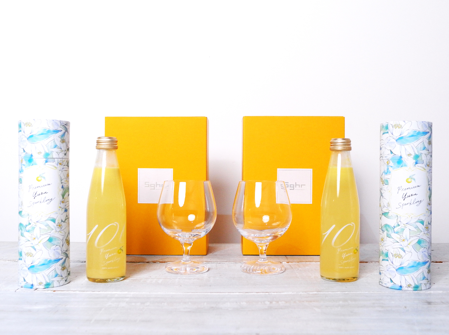 大口注文・法人のお問い合わせはこちら果汁と炭酸だけでつくる無添加ドリンク「Premium Yuzu Sparkling(プレミアム ゆず スパークリング)」と、さまざまなシーンで楽しむことができる「Sghr スガハラ」のグラスの、限定ギフトセットをご用意しました。柑橘カラーとも呼べる「Sghr スガハラ」オリジナルパッケージに包まれた上質なギフトボックスでお届けします。
