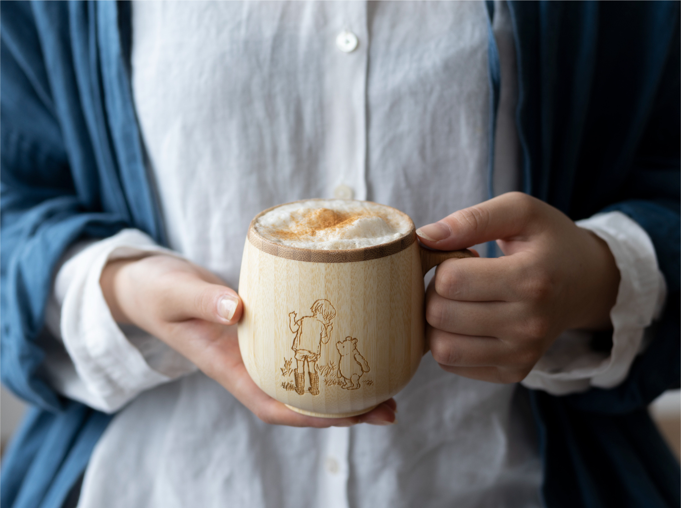 大口注文・法人のお問い合わせはこちらディズニーくまのプーさん原作「Winnie-the-Pooh」の世界が刻印された、クラシックプー特別バージョンのカフェオレマグ。天然素材の食器が、おもむきのある原作絵本の世界をよりクラシカルに表現。天然素材ならではのやさしい口あたりと、ぬくもり伝わる手ざわりのマグカップで、癒しのひとときを。