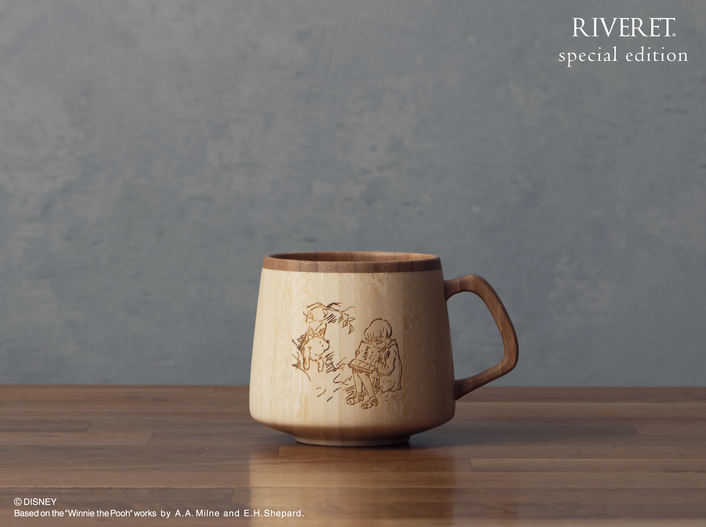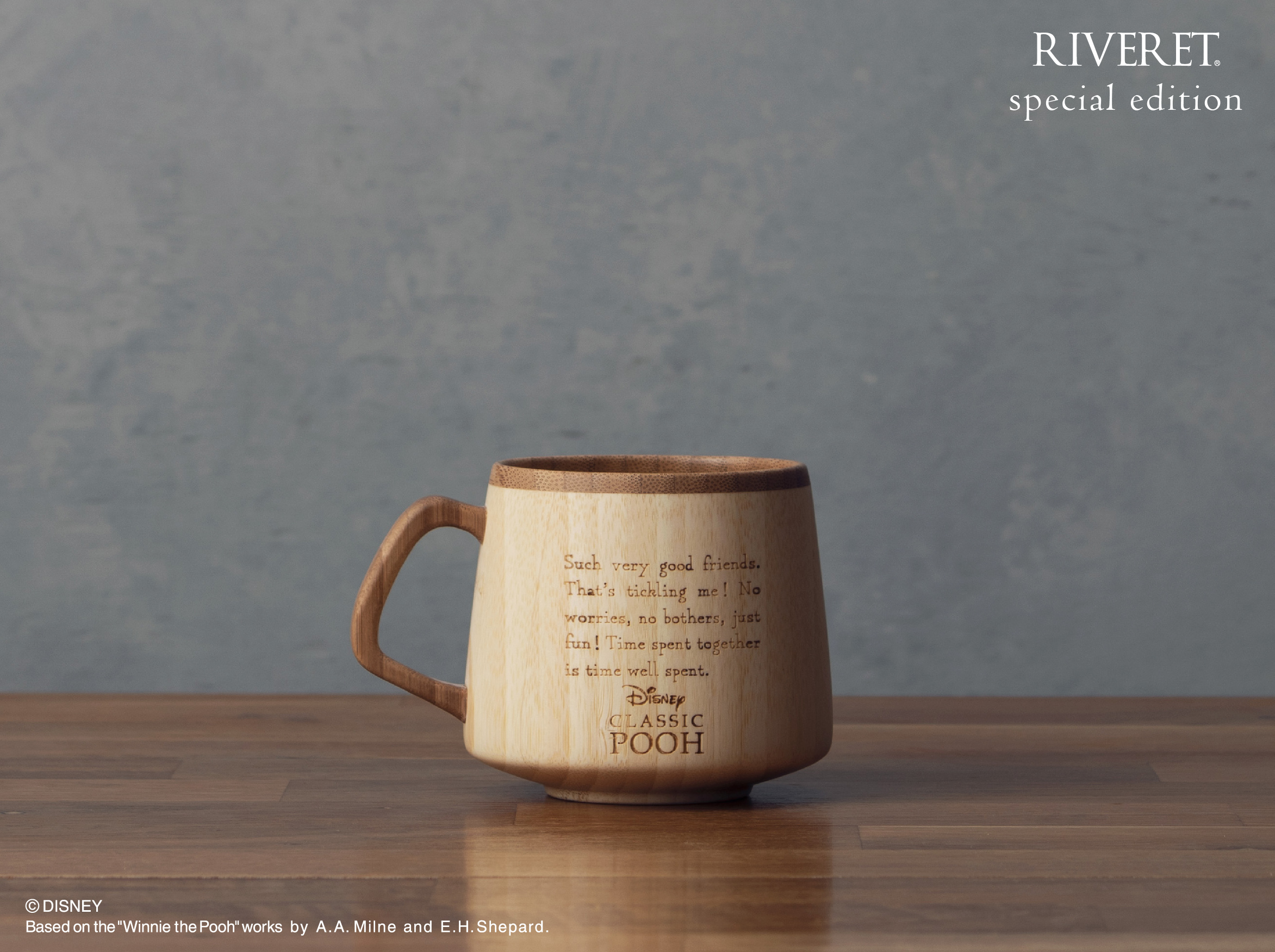 ディズニーくまのプーさん原作「Winnie-the-Pooh」の世界が刻印された、RIVERET特別バージョンのマグカップ。天然素材の食器が、おもむきのある原作絵本の世界をよりクラシカルに表現。天然素材ならではのやさしい口あたりと、ぬくもり伝わる手ざわりのマグカップで、癒しのひとときを。
