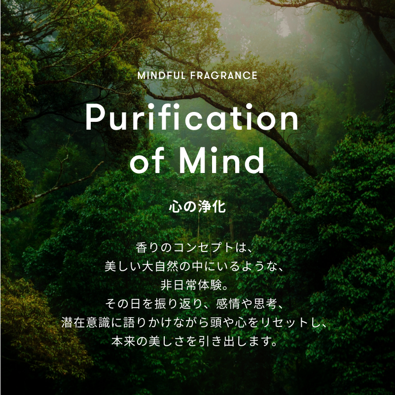 PurIfication of Mind 心の浄化 香りのコンセプトは、美しい大自然の中にいるような、非日常体験。その日を振り返り、感情や思考、潜在意識に語りかけながら頭や心をリセットし、本来の美しさを引き出します。