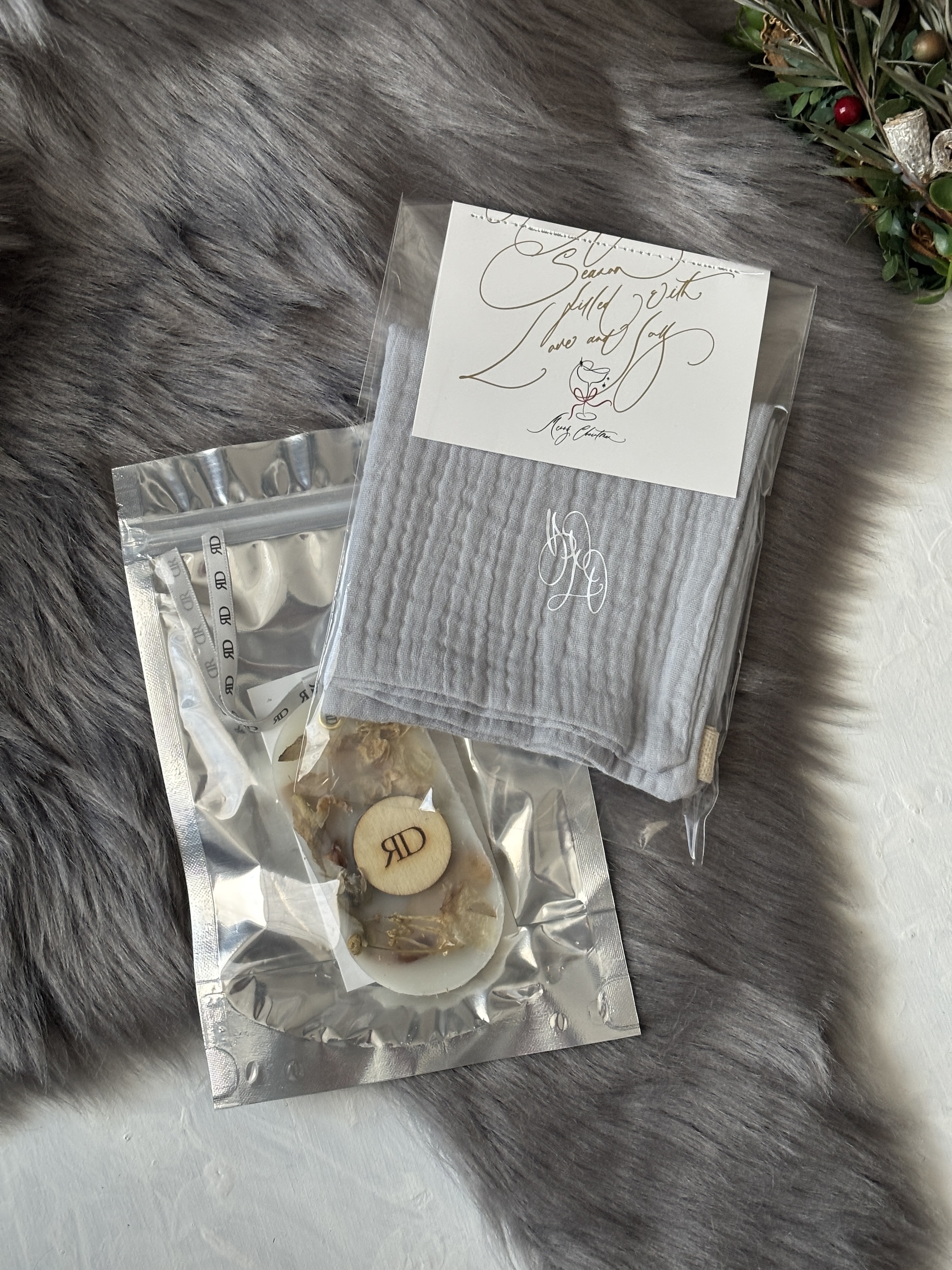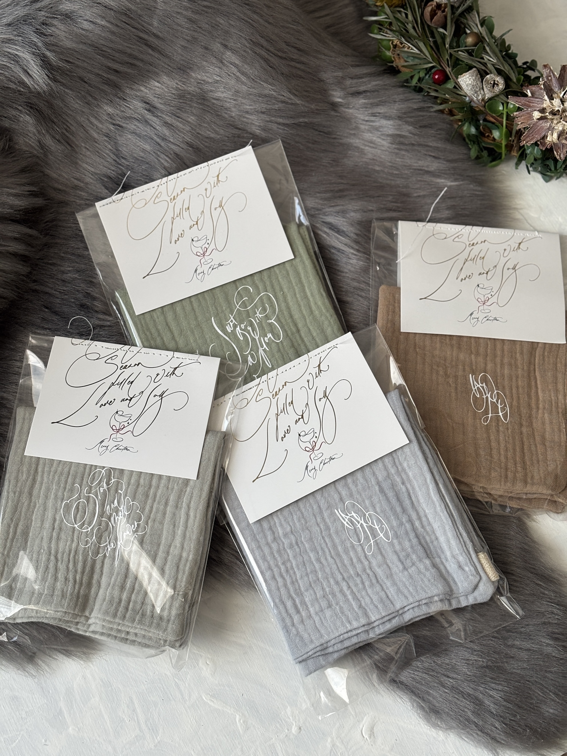 キャンドルサシェとセットになるのは柔らかい素材のコットンタオル。 それぞれ繊細なレタリングデザインが入っていて、どれが届くかはお楽しみ。