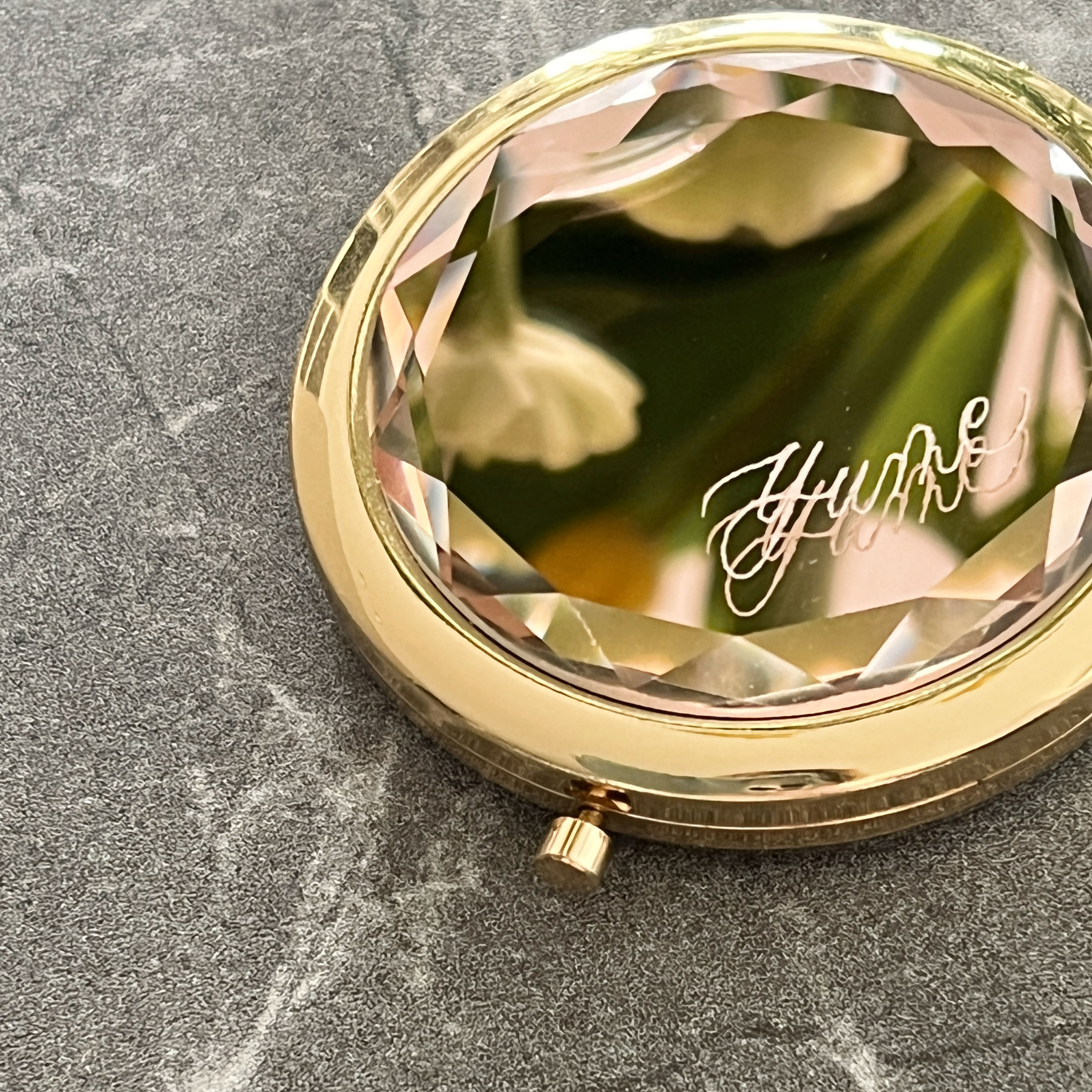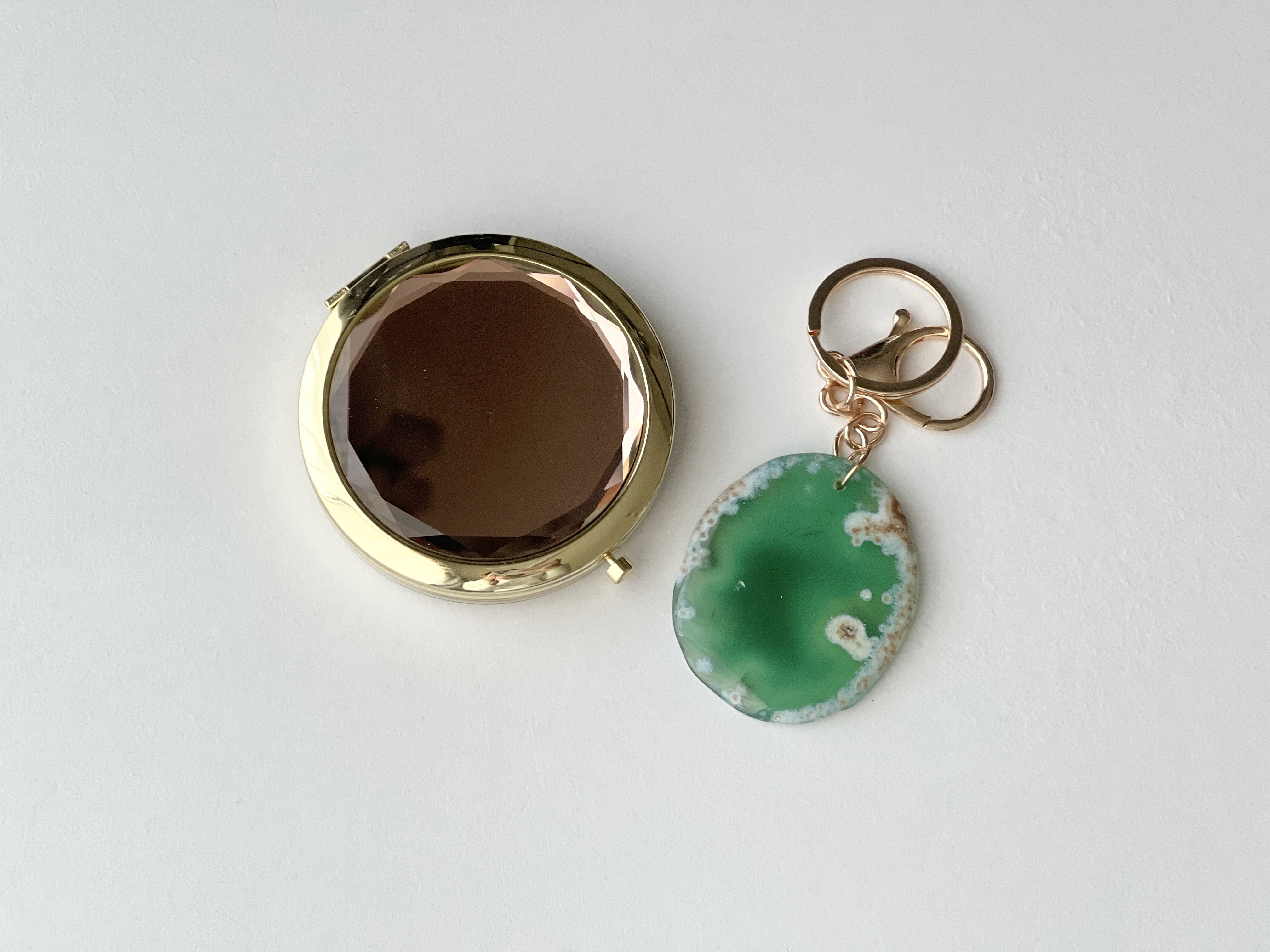 | 原材料 | 名入れコンパクトミラー:アクリルミラー、金属、アゲート キーホルダー:アゲート |