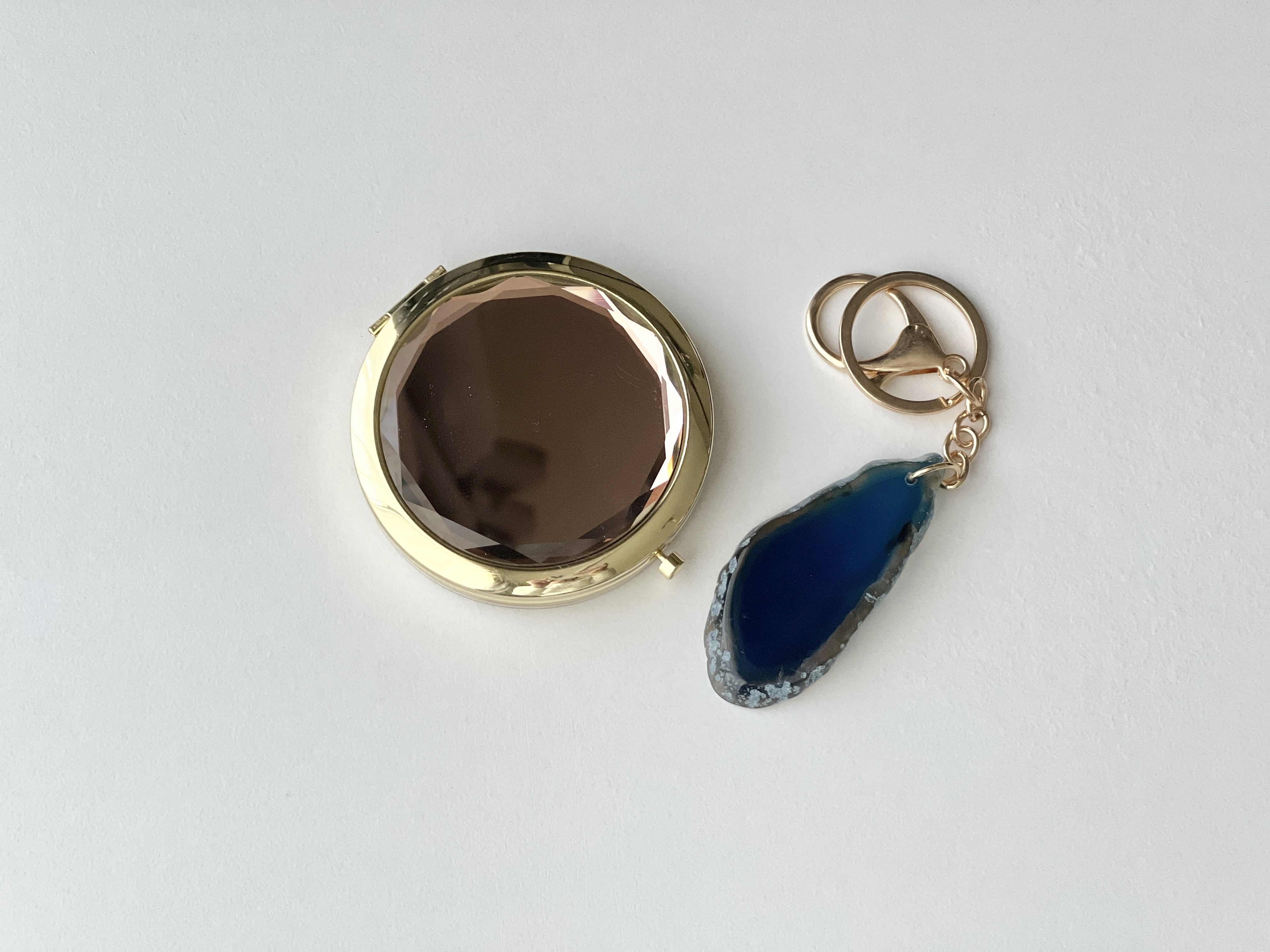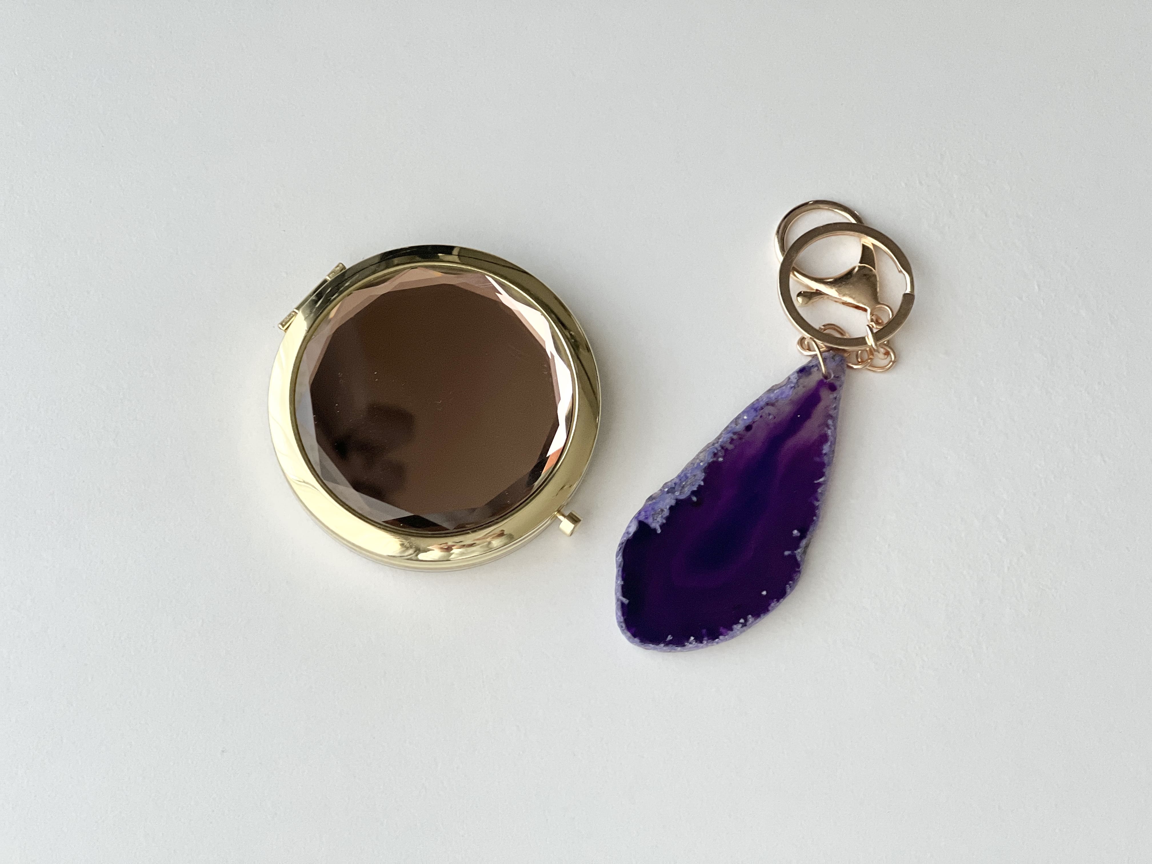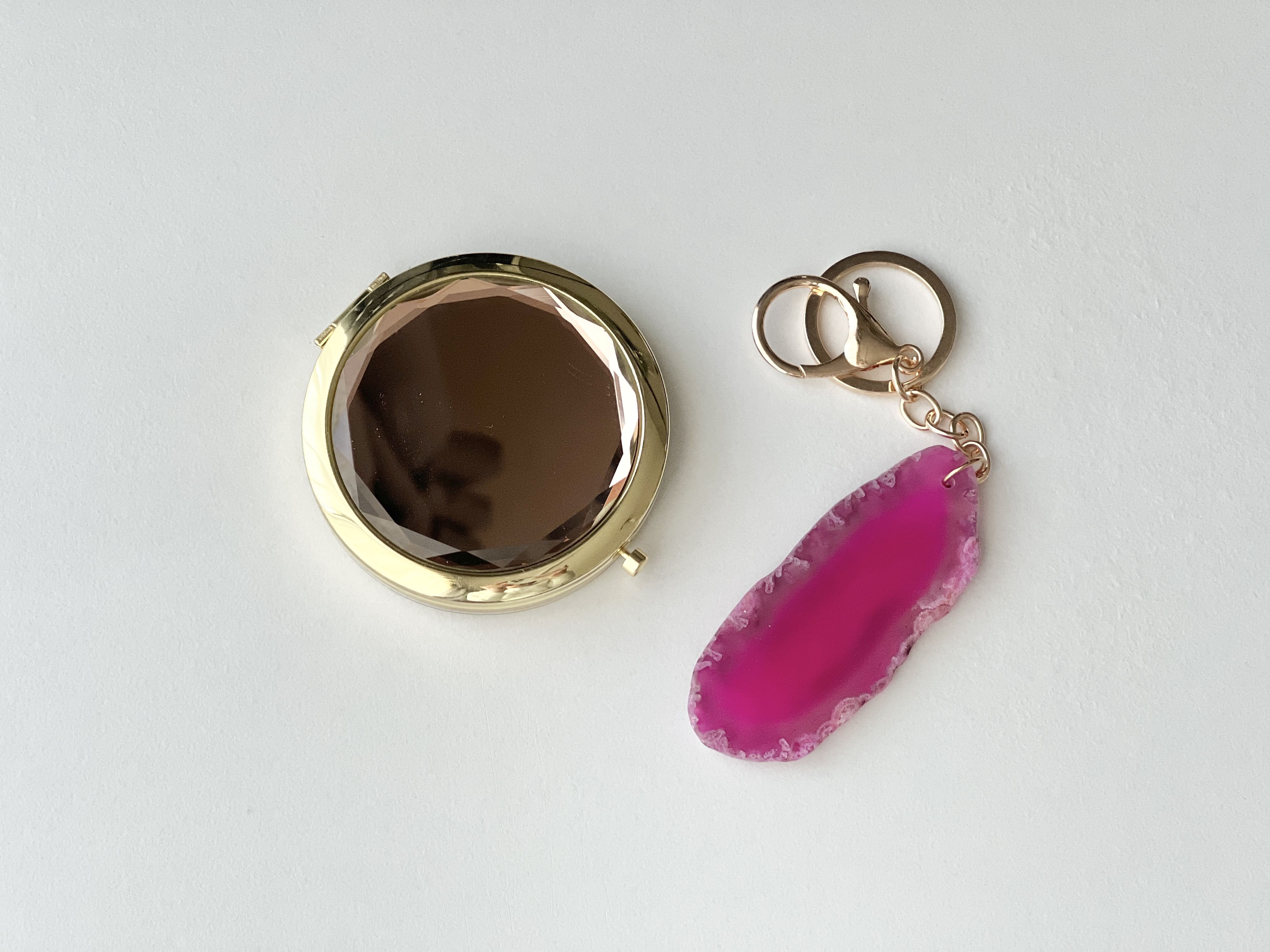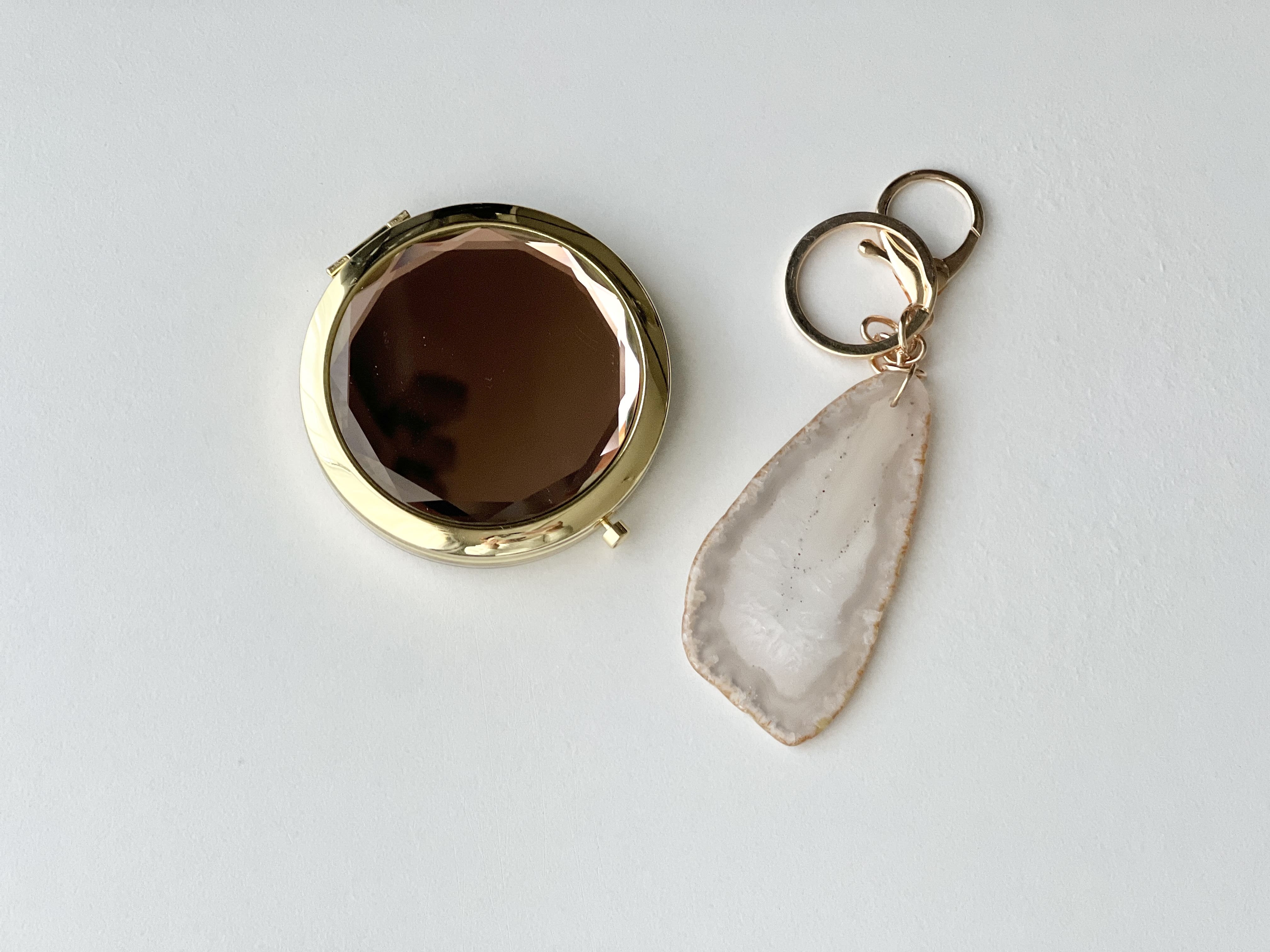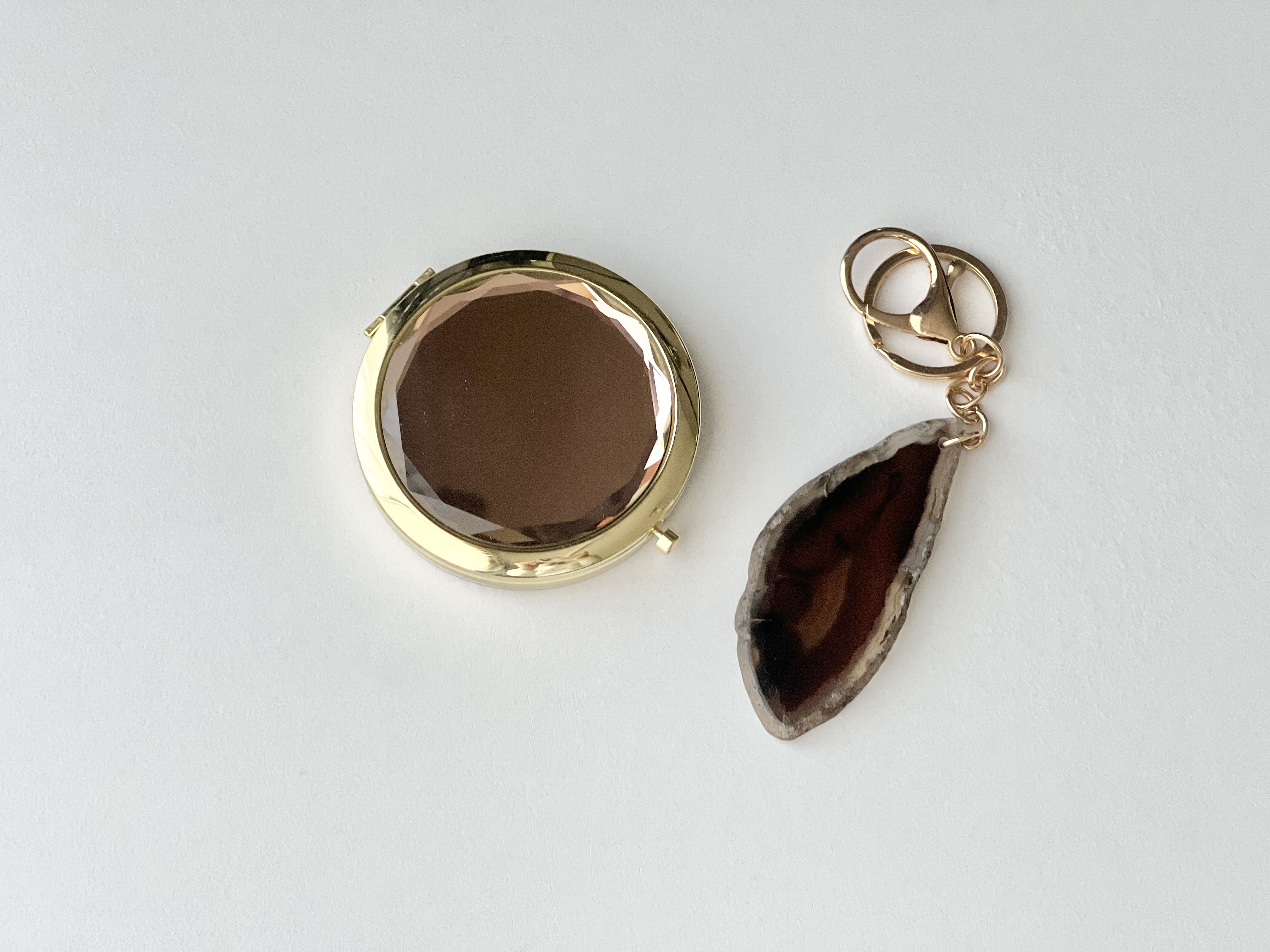 名入れのできるコンパクトミラーと天然石のアゲートを用いたキーホルダーのセットです。お名前を入れてカスタマイズできる特別なギフトセットとしてご用意しました。さまざまな色や模様をもつアゲートは、ファッションアイテムとしても幅広くご活用いただけます。ちょっとしたお礼や誕生日プレゼントにもおすすめです。