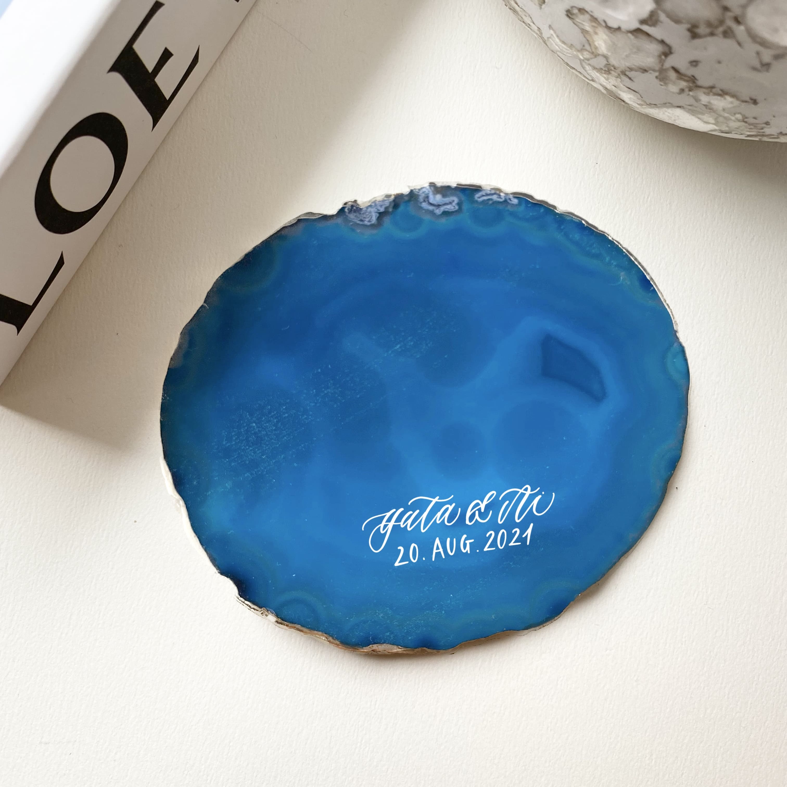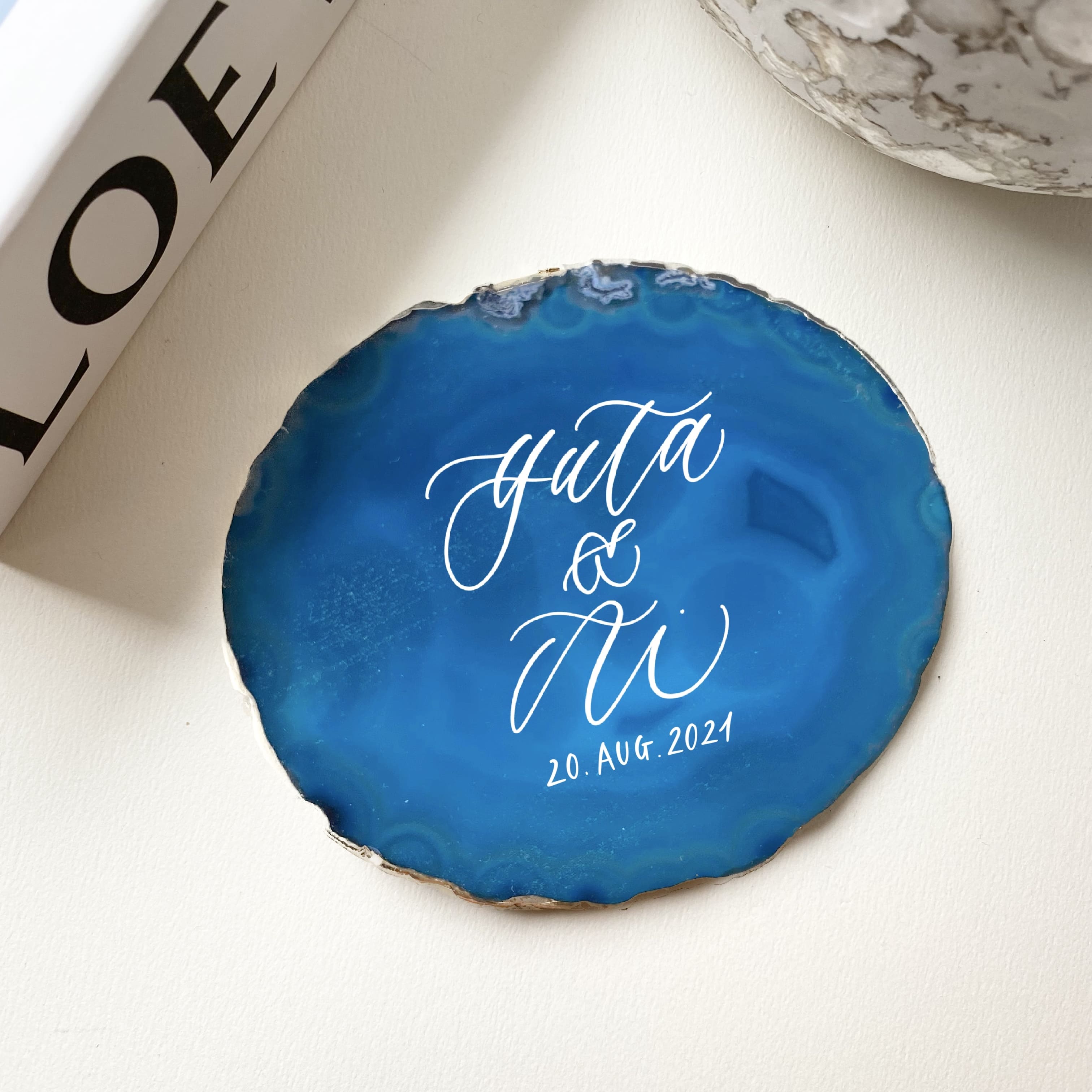 天然石を用いたリングプレートです。天然石のフチをゴールド塗装した華やかなアイテム。お名前などを入れてカスタマイズできる特別なギフトです。リングピローの代替品として挙式後もご活用いただけるようなアイテムなので挙式グッズのみならず、インテリアやアクセサリーとしても幅広くご活用いただけます。