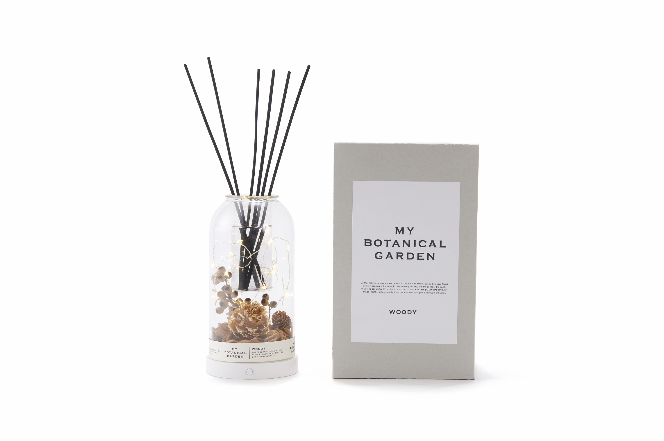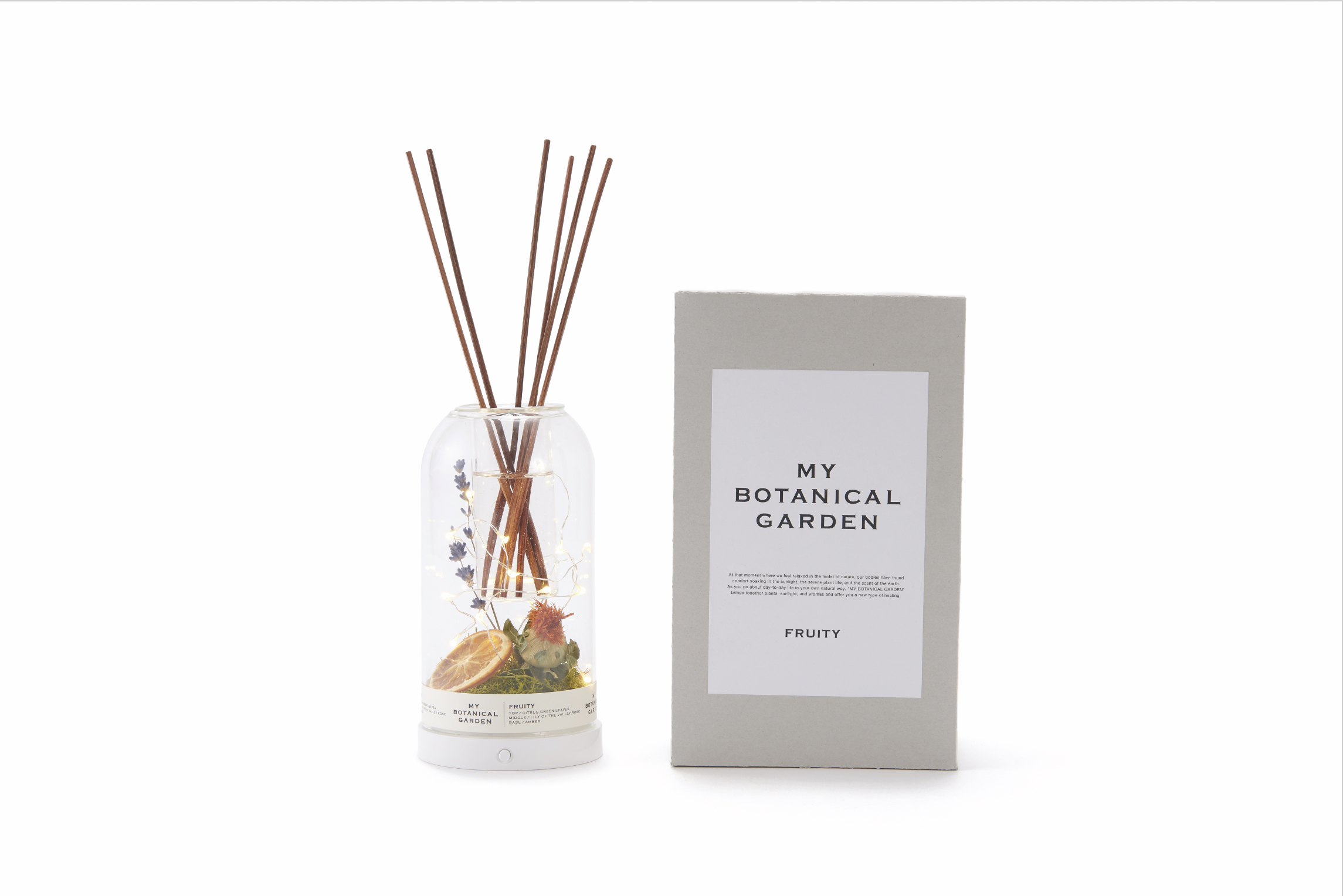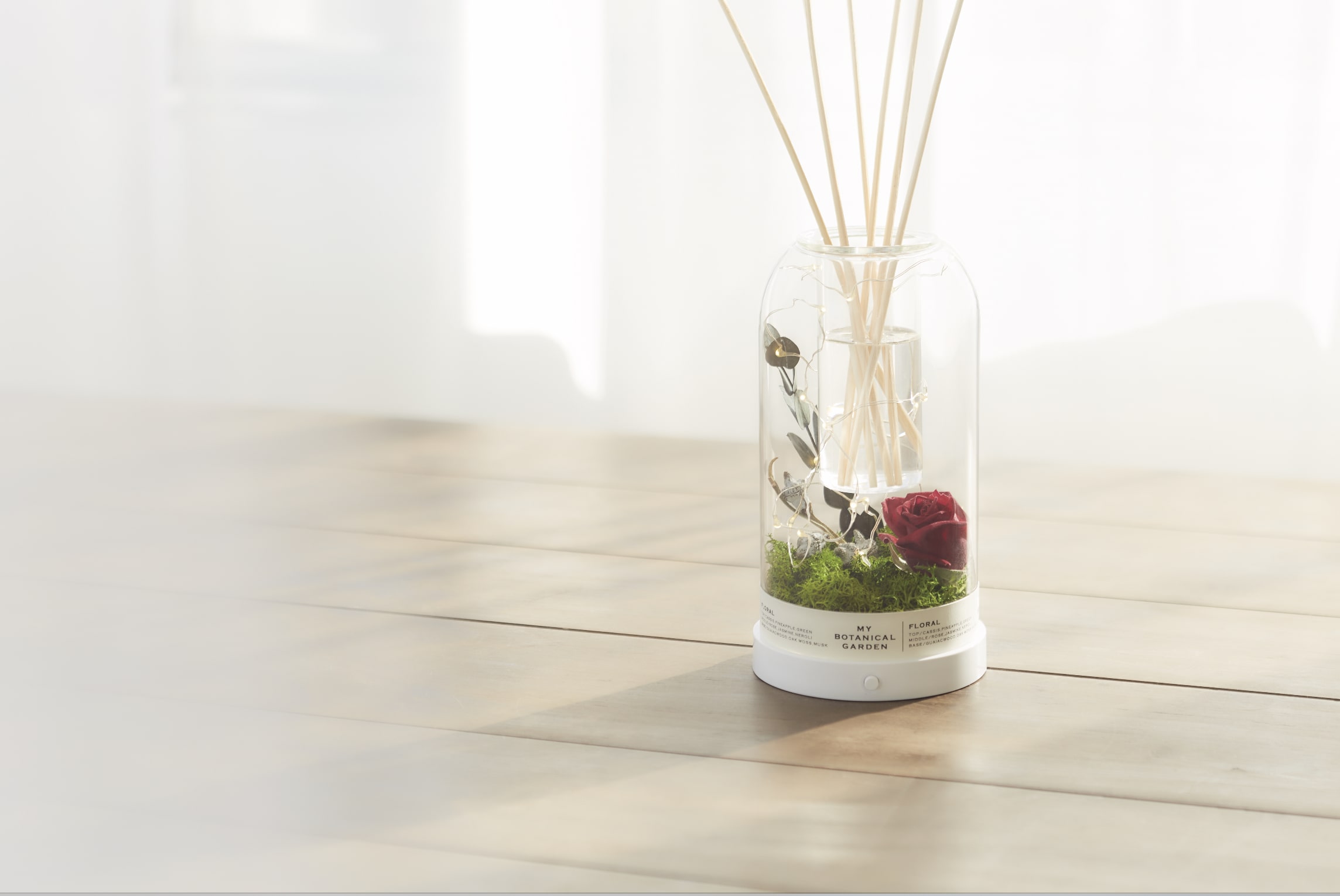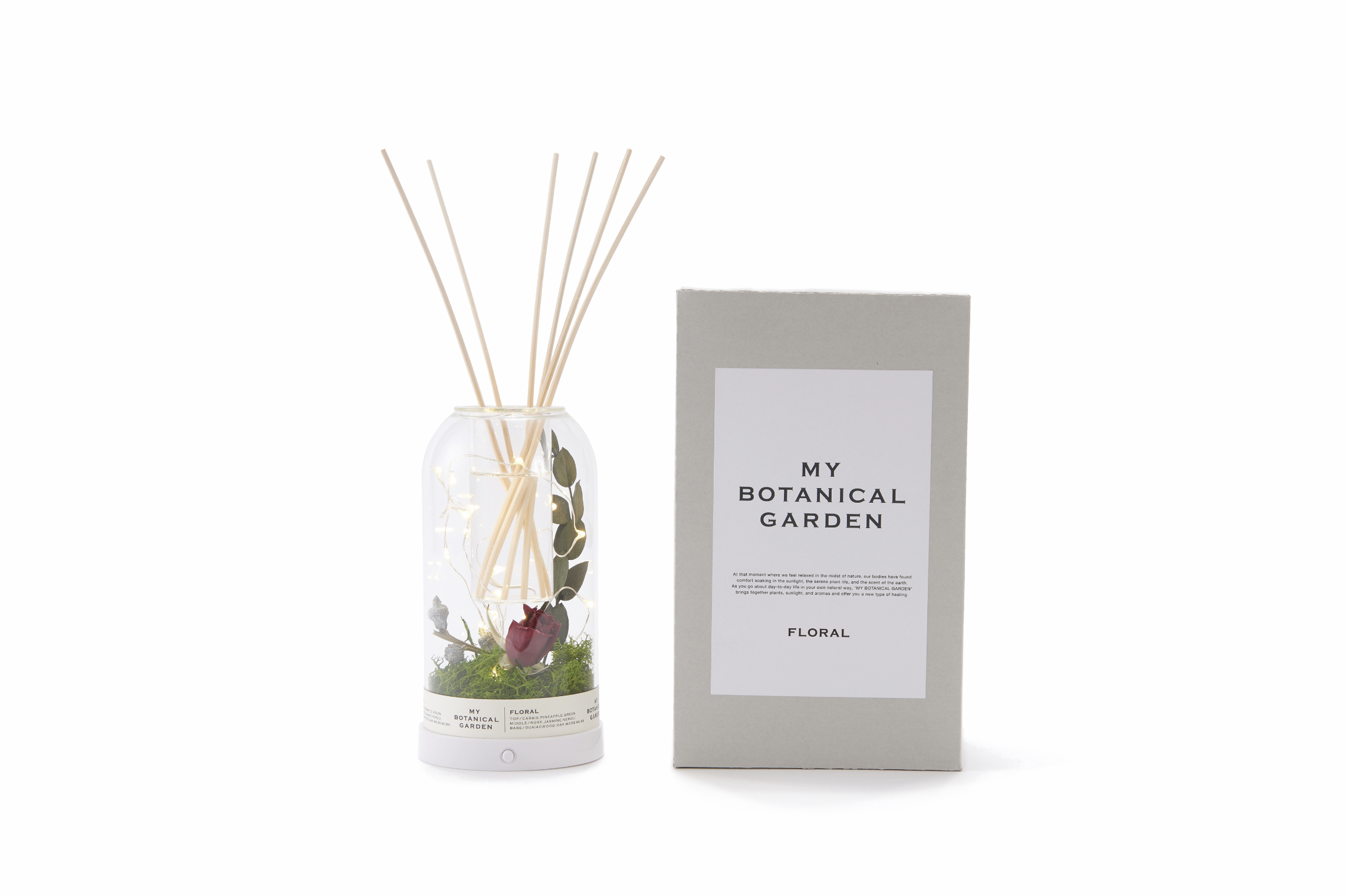 「MY BOTANICAL GARDEN(マイボタニカルガーデン)」の本物のドライフラワーとライトと香りを同時に楽しんで頂けるインテリア性を高めたフレグランスディフューザーです。「FLORAL」「WOODY」「FRUITY」の3種類の中からお選びいただけます。