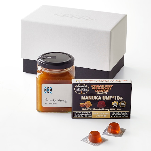 大口注文・法人のお問い合わせはこちら厳しい基準をクリアしたマヌカハニーとUMF10+の喉あめのギフトセットです。 マヌカハニーの人気の高まりの中で、質の高いマヌカハニーの喉あめが製造されたことにより、手軽にケアできると大人気の商品となりました。 特に健康を気遣う方に使っていただきたいという思いから、このギフトは誕生しました。 そんなマヌカハニーと、マヌカハニーUMF10+だけで作られた喉あめをセットにしました。 瓶入りのマヌカハニーはご自宅で、喉あめは移動中などに手軽に使えるのにしっかりとケアできると喜ばれています。