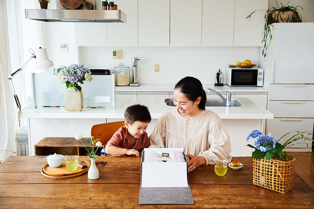 あなたの想いを大切に届けるために、特製の上質な専用パッケージでお届けします。 品を重んじた、質感と機能性にこだわったパッケージをデザインしました。 深みのあるダークグレーの箱をゴールド箔をあしらったブランドステッカーで飾ります。高級ギフトにふさわしい落ち着いたパッケージとなっております。
