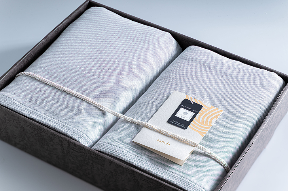 今治タオル工業組合が定める品質基準をクリアしたタオルのみつけることができる「今治タオルブランドネーム」と、ひとつひとつ大切に作られた証である「sara-laシリアルナンバー」を添えてお届けします。