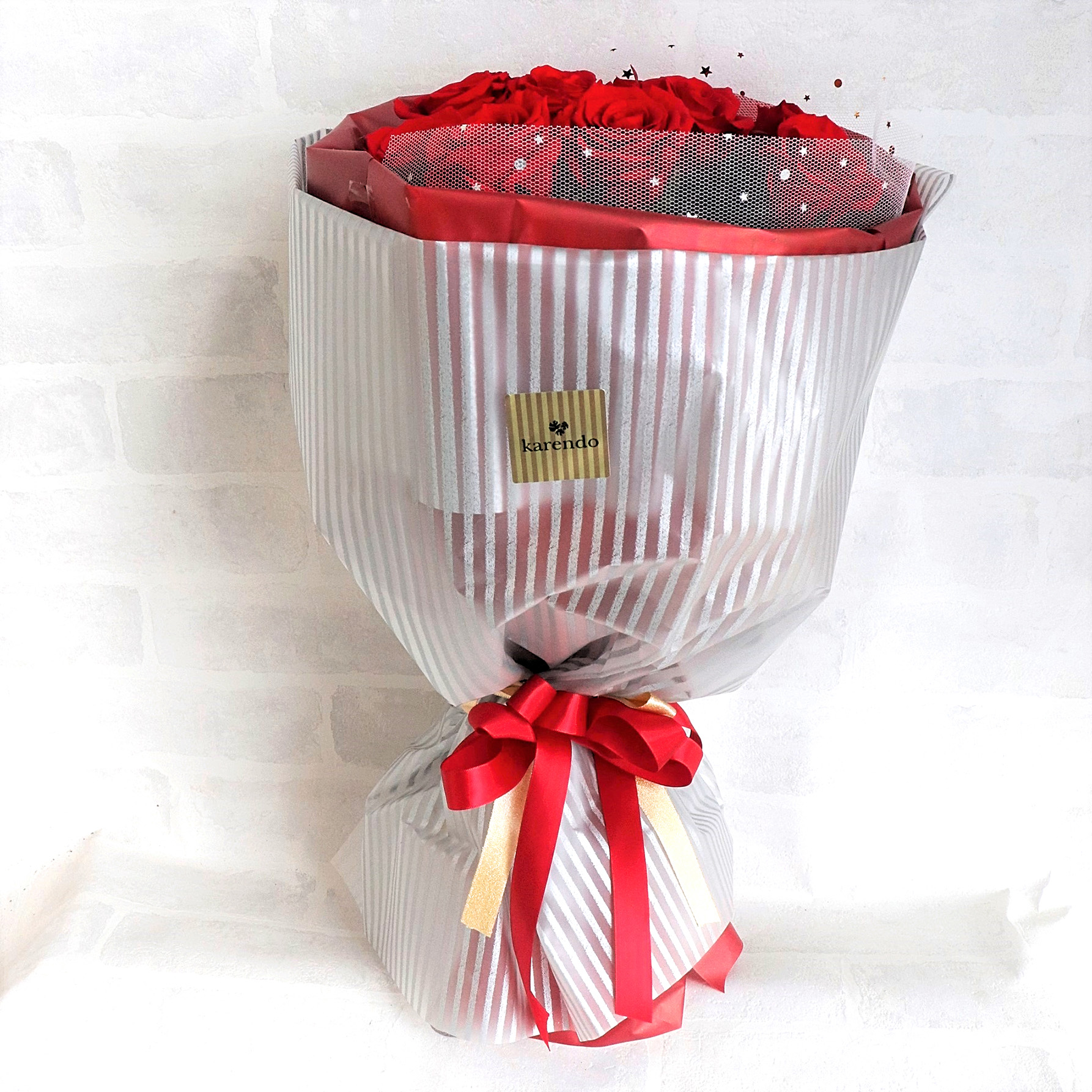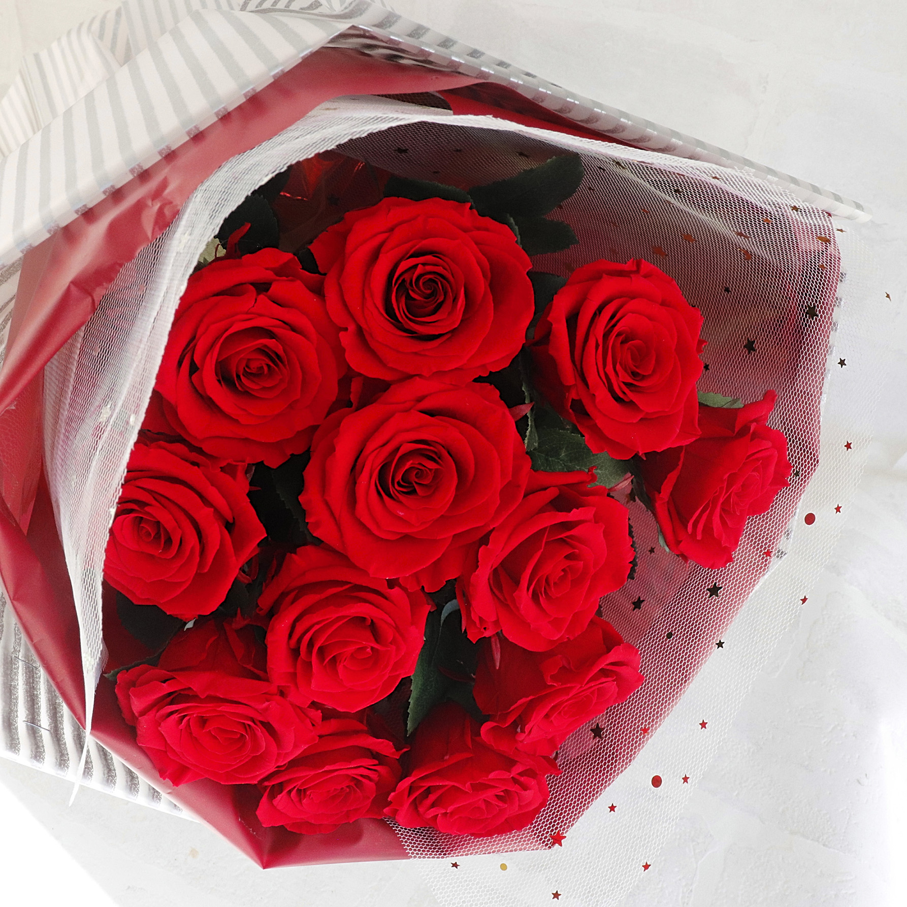 誰もが憧れる赤バラのブーケ。12本のバラはそれぞれが「感謝、誠実、幸福、信頼、希望、愛情、情熱、真実、尊敬、栄光、努力、永遠」の意味を持っています。プリザーブドフラワーのなので、枯れることなく美しい状態のまま長期間お楽しみいただけます。