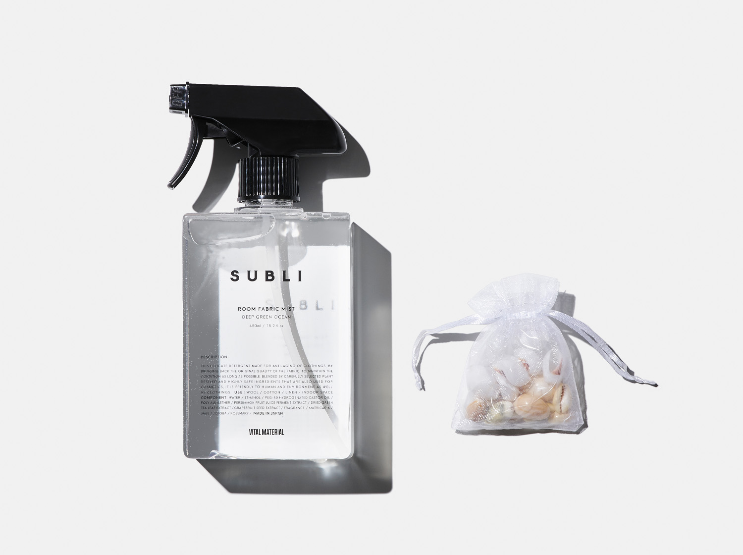 ●付属品について こちらのファブリックミストには、インテリアとしても楽しんでいただくために、貝殻が別で付属します。貝殻を液体の中へ入れて、スプレーを使用される場合は以下の注意点がございます。 ※貝殻を液体へ入れられますと貝殻の色味が液体に移りますので、ご了承のうえでお入れください。 ※貝殻を入れられた場合は、ルームミストとして空間へご使用ください。 ※シミになる恐れがありますので白い衣類、 生地へのご使用は避けてください。