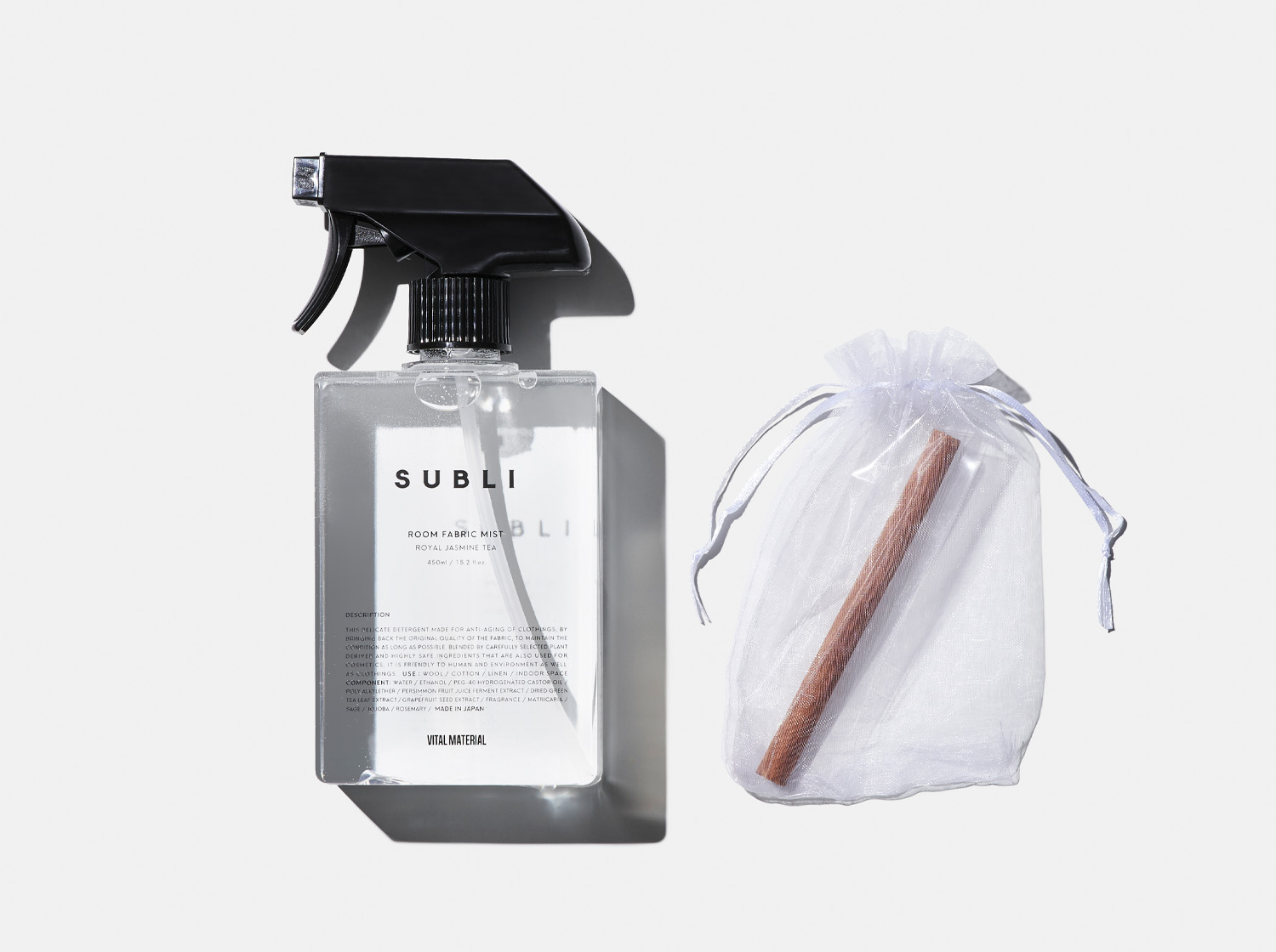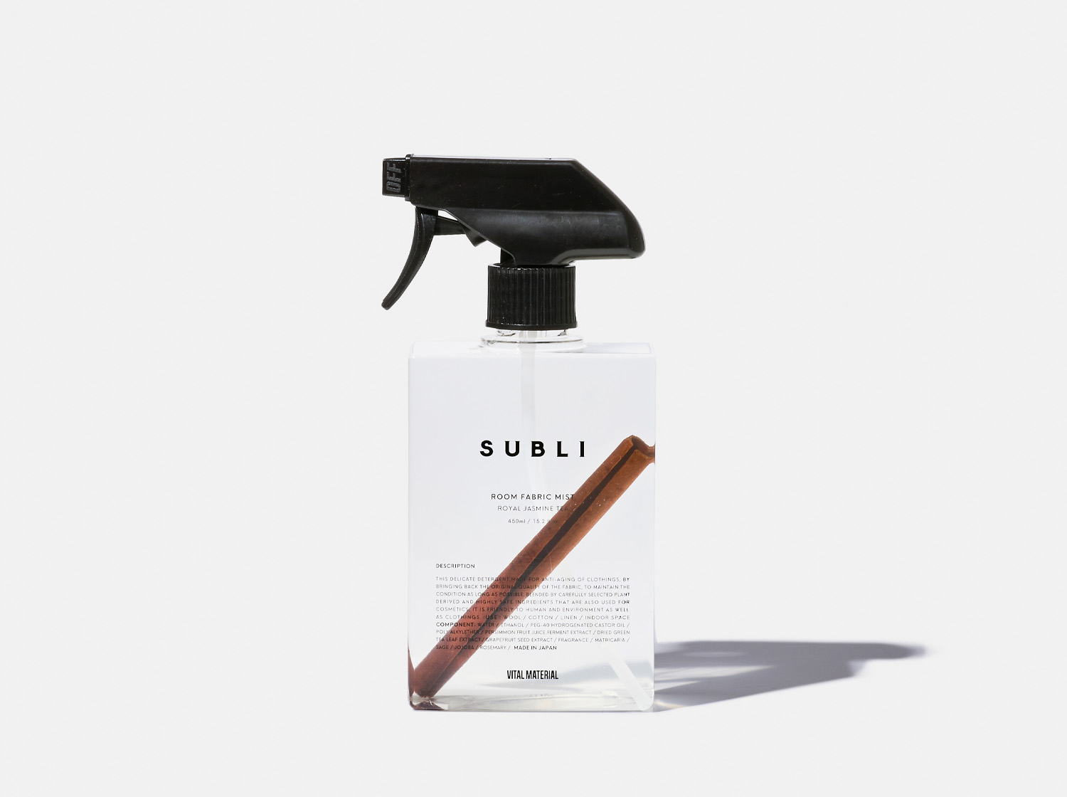 ●付属品について こちらのファブリックミストには、インテリアとしても楽しんでいただくために、シナモンスティックが別で付属します。シナモンスティックを液体の中へ入れて、スプレーを使用される場合は以下の注意点がございます。 ※シナモンスティックを液体へ入れられますとシナモンスティックの色味が液体に移りますので、ご了承のうえでお入れください。 ※シナモンスティックを入れられた場合は、ルームミストとして空間へご使用ください。 ※シミになる恐れがありますので白い衣類、 生地へのご使用は避けてください。