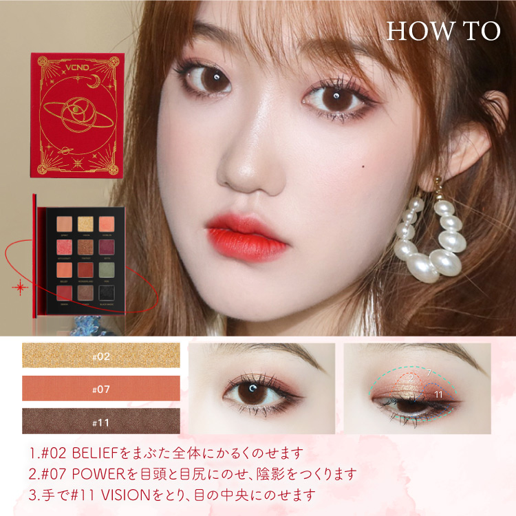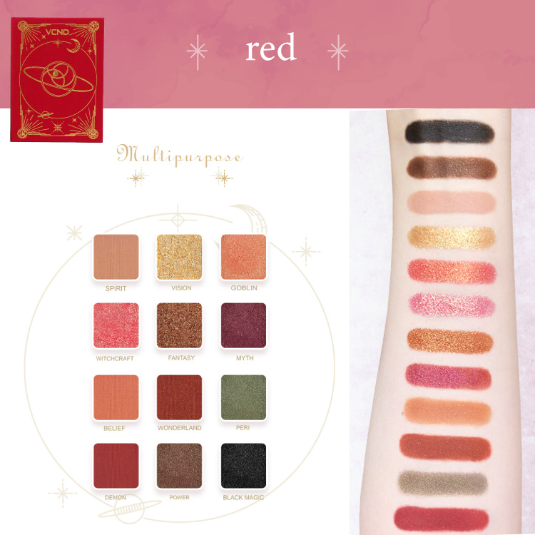 魔法少女のアイテムのような、乙女心くすぐる中国コスメブランド「VCND(ブイシーエヌディー)」より、アイシャドウパレットをお届け。マット・パール・グリッターの3つの質感のトレンドカラーが12色入っており、メイクのバリエーションを広げてくれます。また、魔法書のようなゴージャスなパッケージもおすすめポイントです。