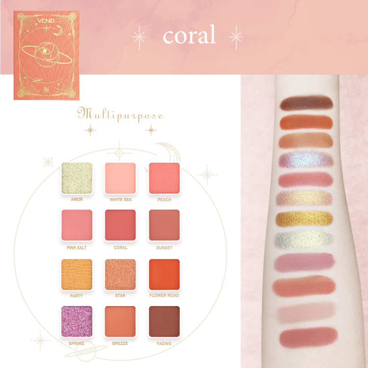 ■coral(コーラル) 愛らしい目元を叶えるコーラル系カラー! 使いやすいピンクやピーチ系カラーに、アイメイクのポイントになるコーラルカラー、輝きをプラスできるグリッターカラー、締め色にバッチリなブラウン系と使いやすい配色。トレンド感のある多彩なメイクが楽しめます。
