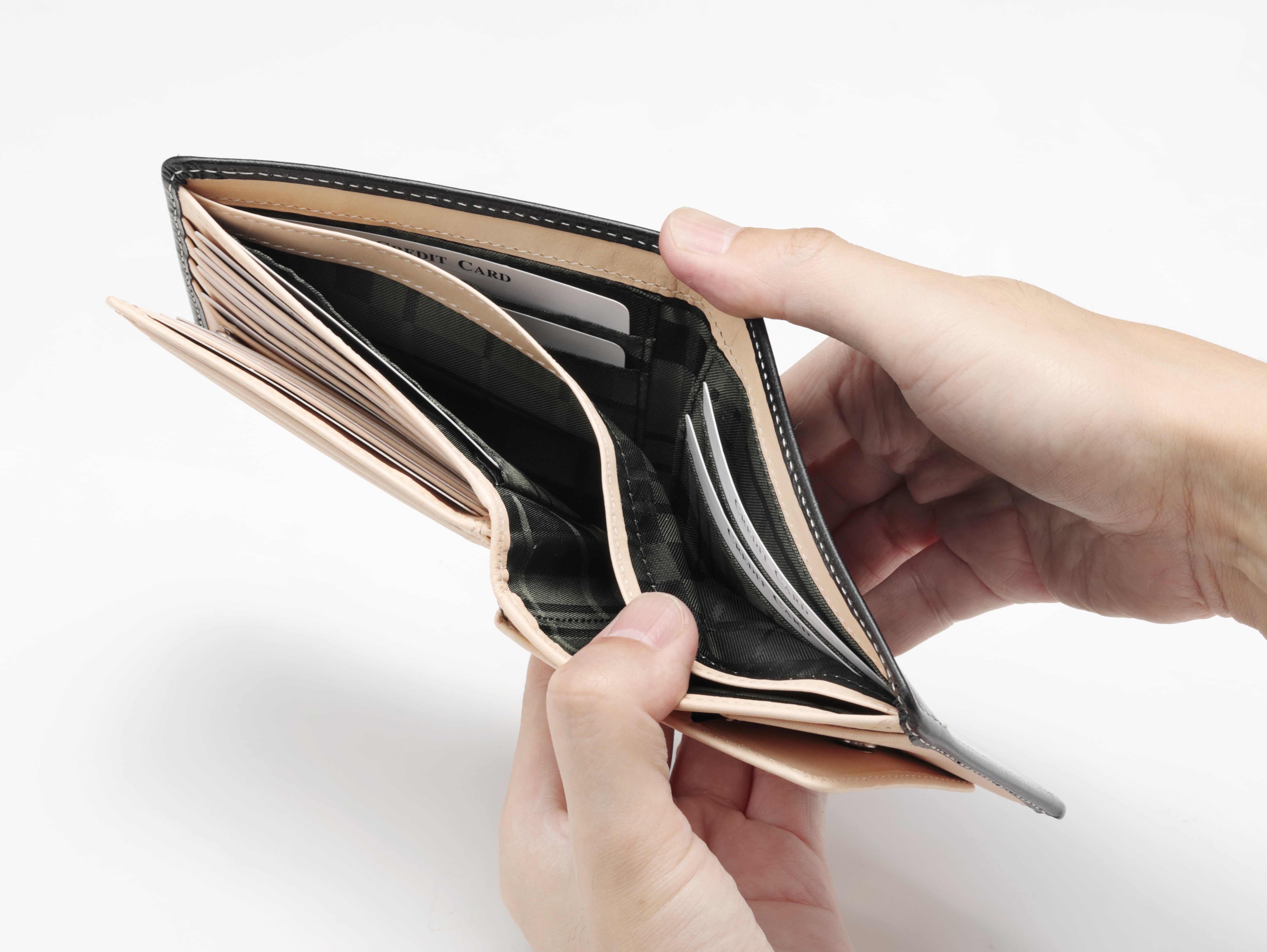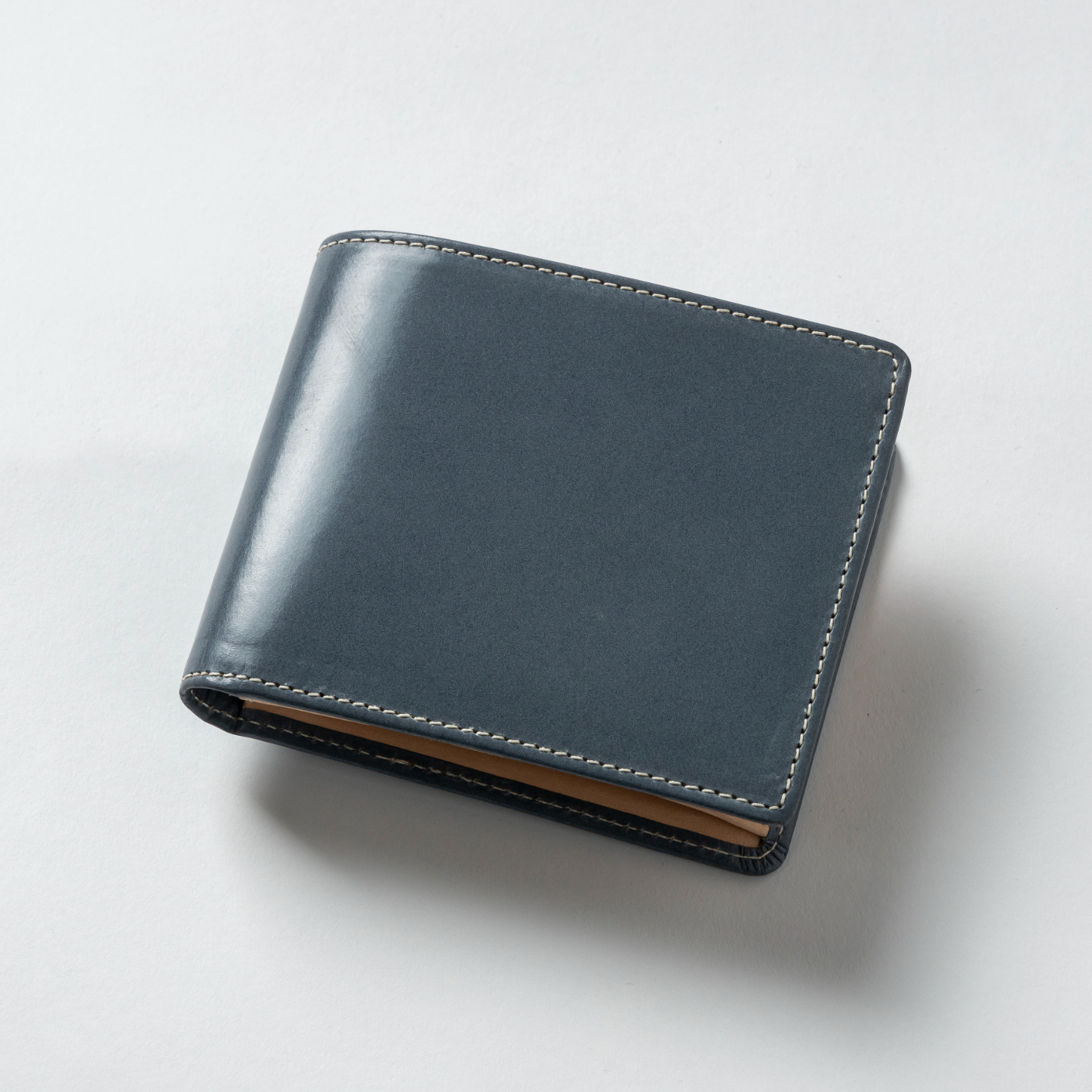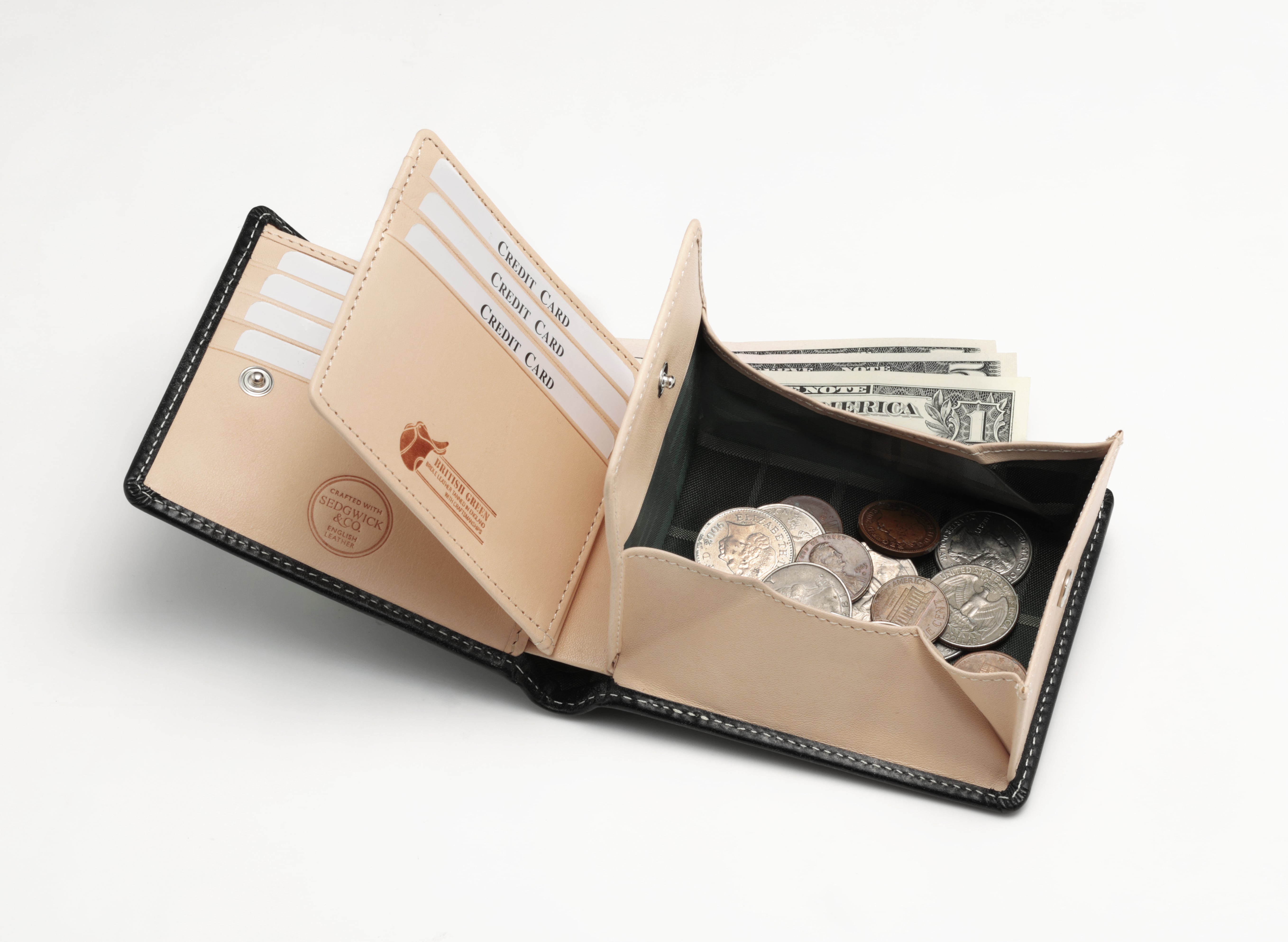 中の小銭が一目瞭然のボックス型小銭入れは、細かな小銭を支払うときに出しやすく、とても重宝します。15枚分のカード入れを設け、コンパクトな二つ折りサイズながら十分な収納力も兼ね備えています。 中のカードスロットにはスナップボタンを配し、カードを全て入れた時にもおさまりがよくなるように改良しました。
