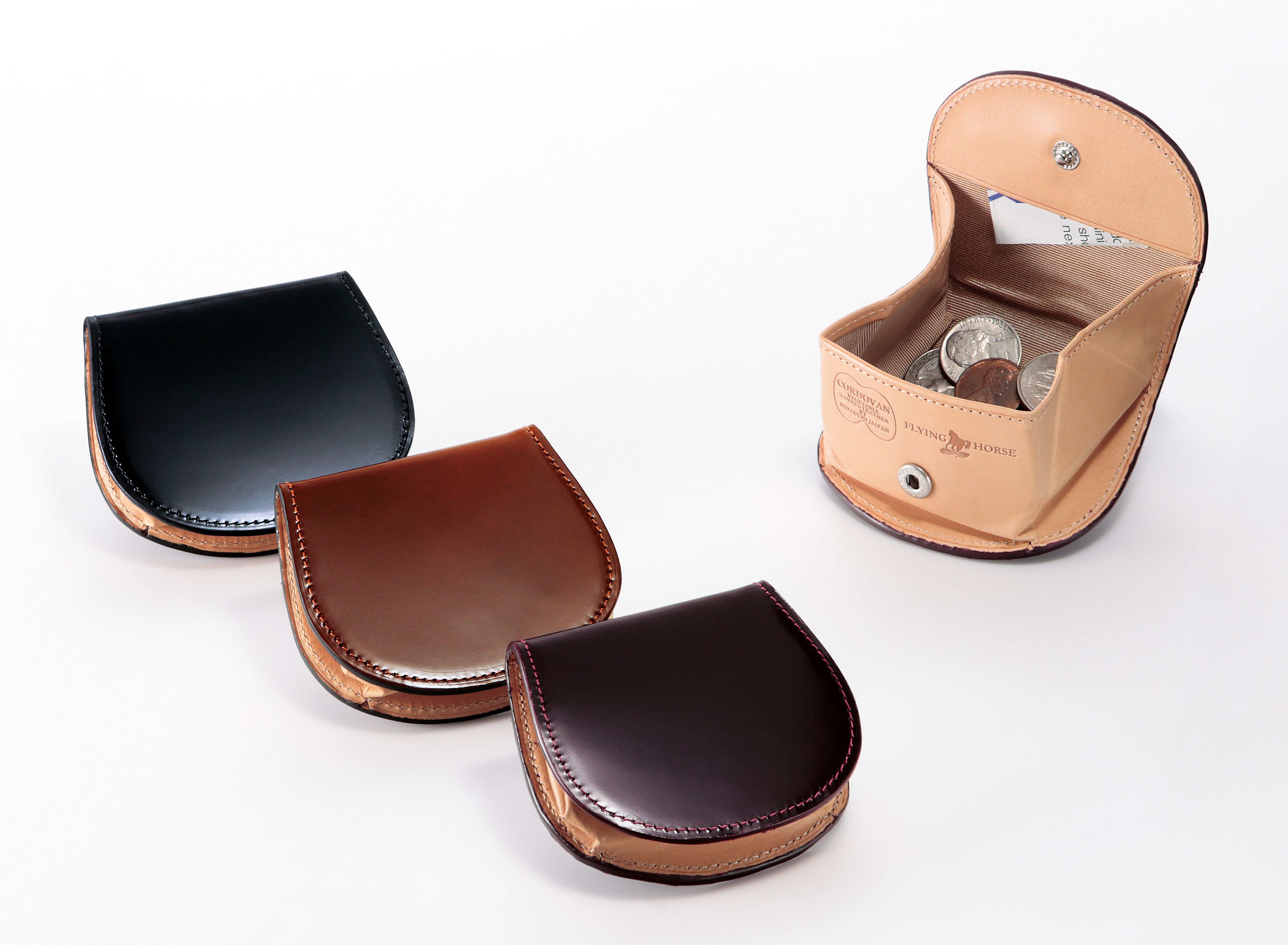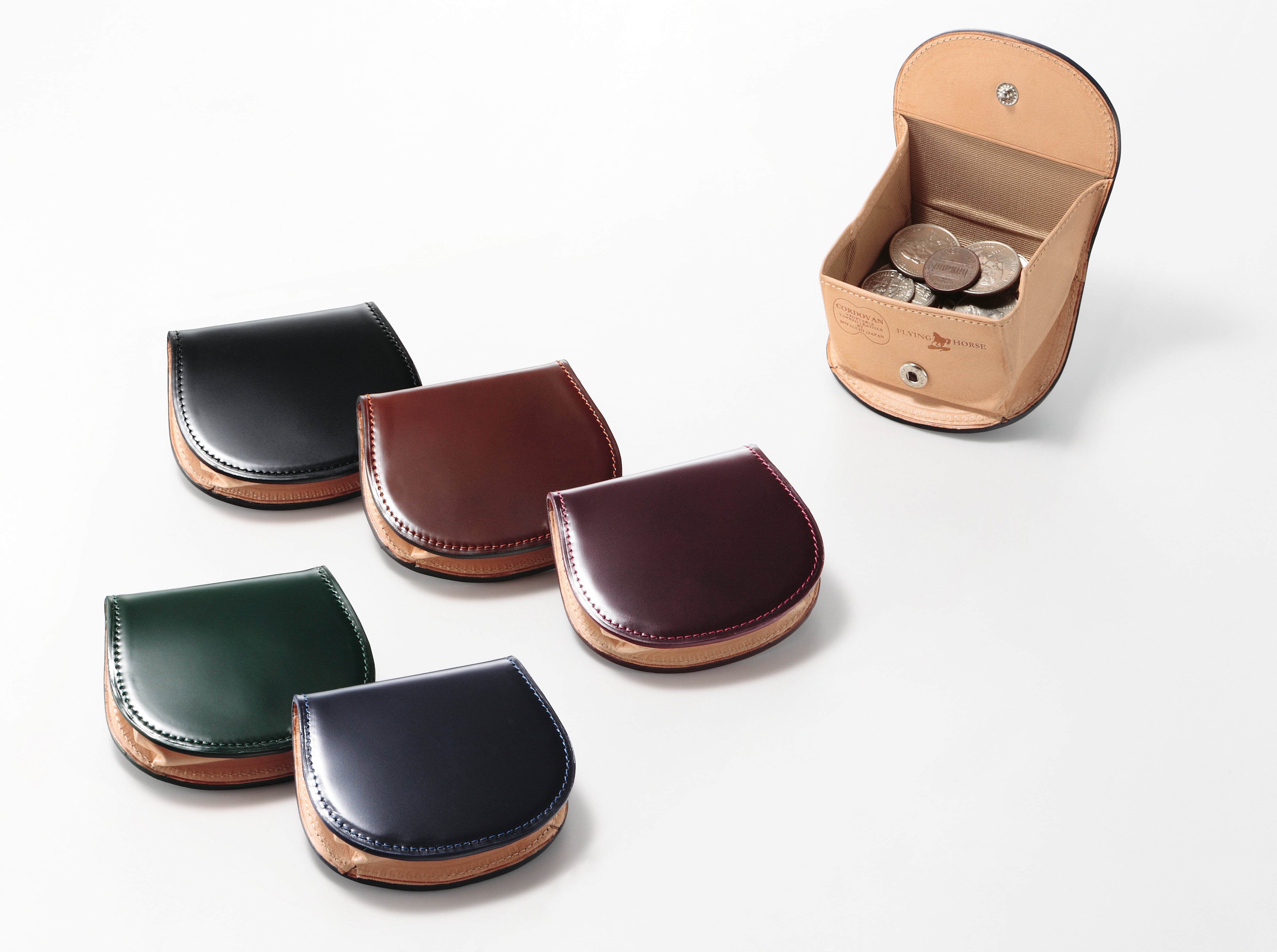 大口注文・法人のお問い合わせはこちらレザーの王様コードバン革の輝きが美しい、ホースシューコインケースです。馬蹄型の仕様は使い勝手も優れており、コインも一目で判別できます。内側の素材には、ヌメ革をセレクトしているため、日に日に風合いを増していく革の変化もおたのしみいただけます。