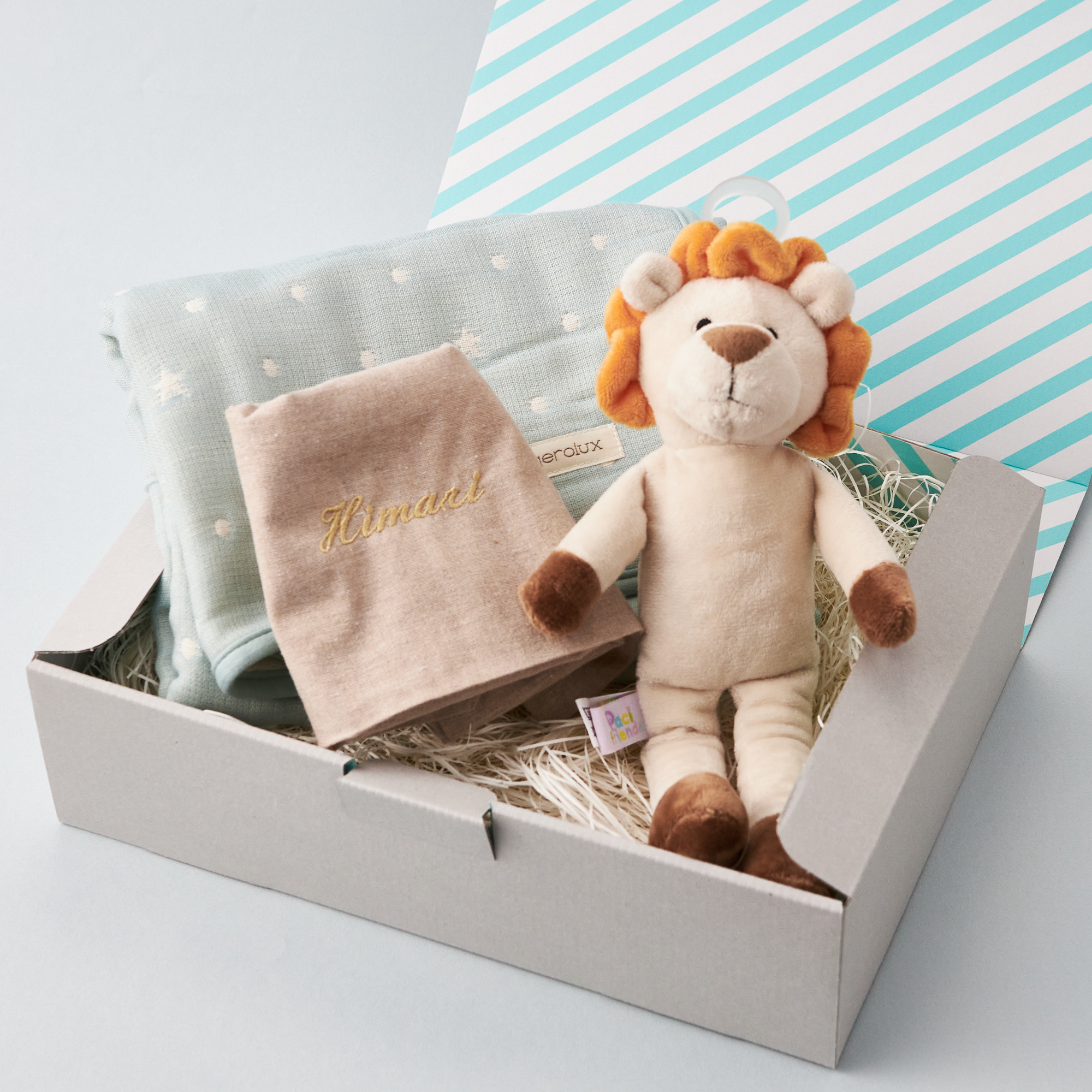 木製玩具で人気な「Paci friends(パシフレンズ)」のおしゃぶり付き抱っこぬいぐるみと、とても柔らかく乾きも早い「三河木綿」を使用したガーゼのセット。 出産祝いやお子さんのお誕生日にぴったりなタンプ限定ギフトボックスに入れてお届けします。