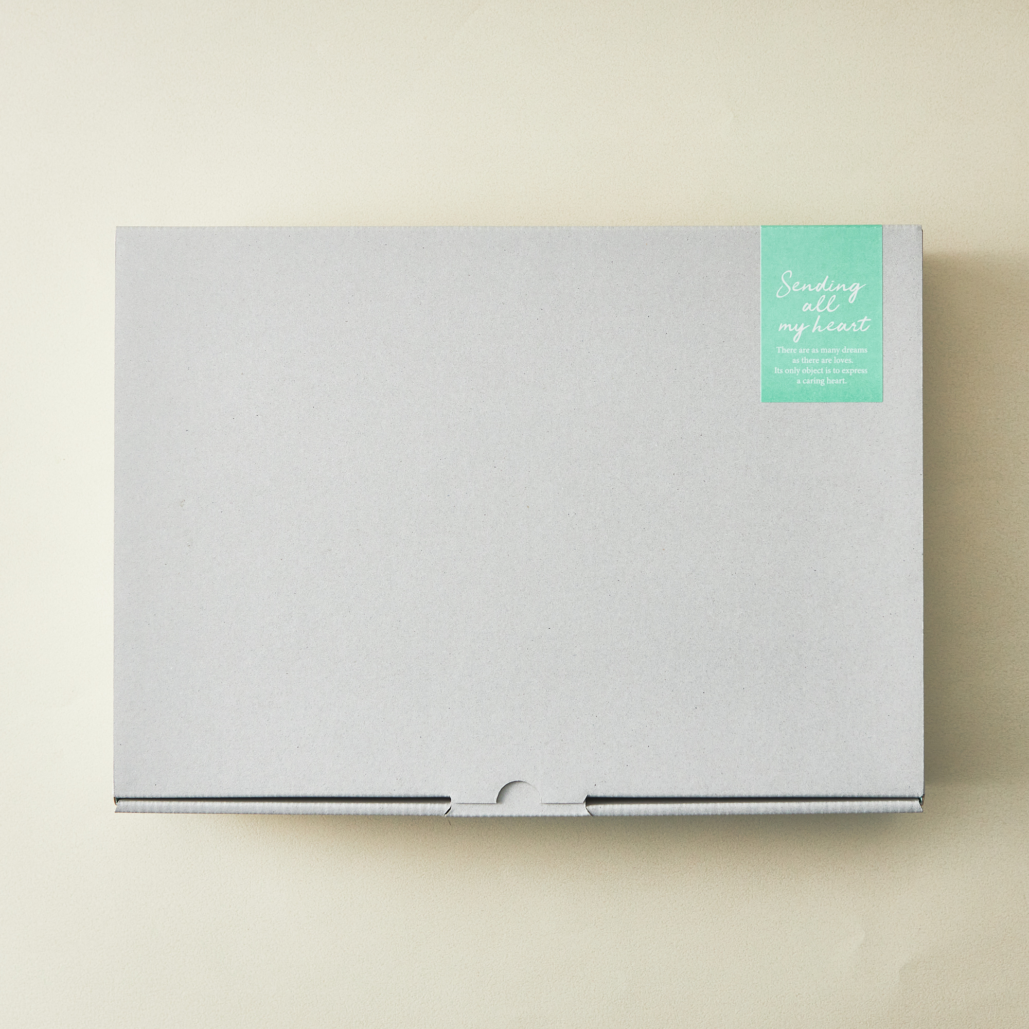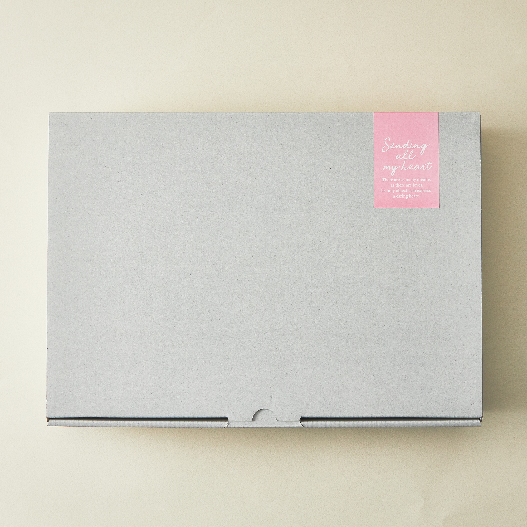 グレーのボックスにパステルカラーのシールを貼ってお届けします。 中のストライプカラーに合わせて、ピンクとブルーのボックスをお選びいただけます。