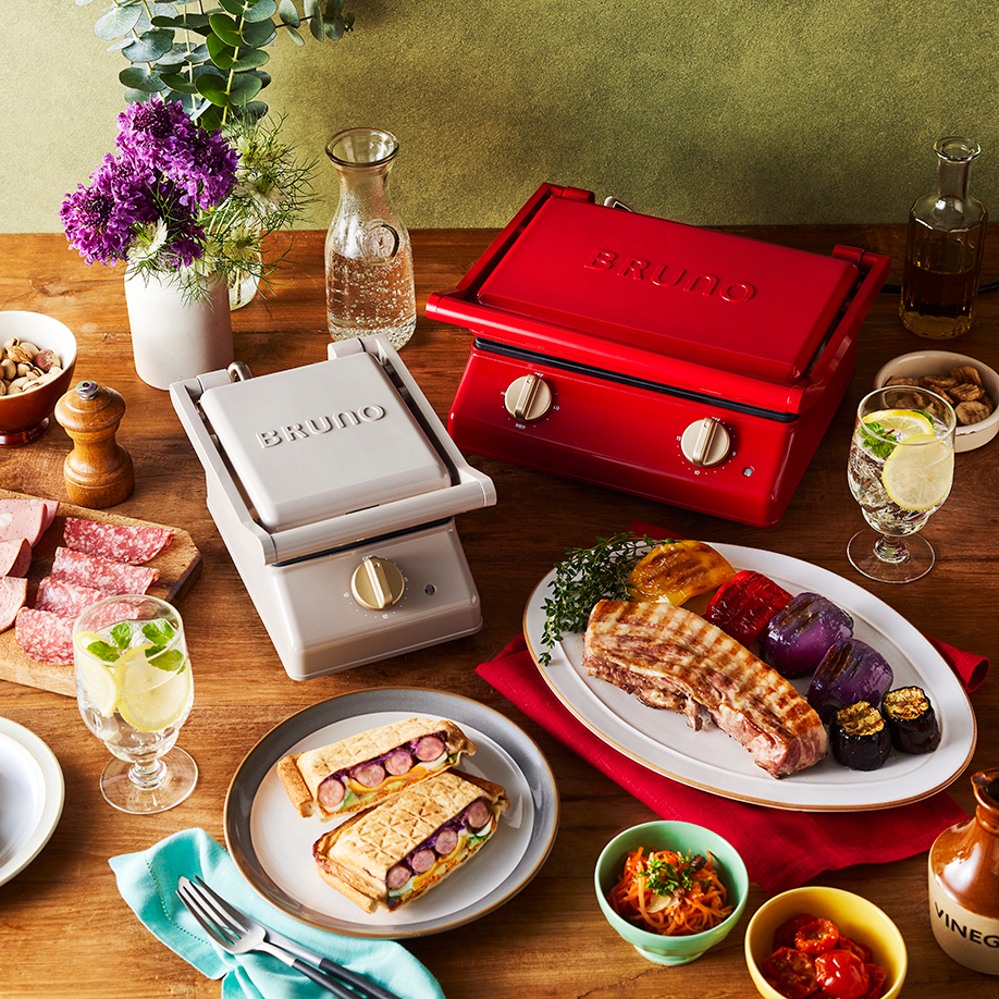 大口注文・法人のお問い合わせはこちら朝も昼も晩も、とことん愉しめるグリルサンドメーカー。ギュッと挟んで焼くだけで、ホットサンドが手早く完成するのでお子さんの軽食が手軽に作れます。プレートは取り外し式でお手入れも簡単。ヨーロッパの焼き菓子をモチーフにした焼き目が食卓を華やかに彩ります。 カラーは「レッド」と「グレージュ」の2色からお選びいただけます。 レシピカードが同梱されており、「BRUNO(ブルーノ)」ファンサイトでレシピをチェックできます。