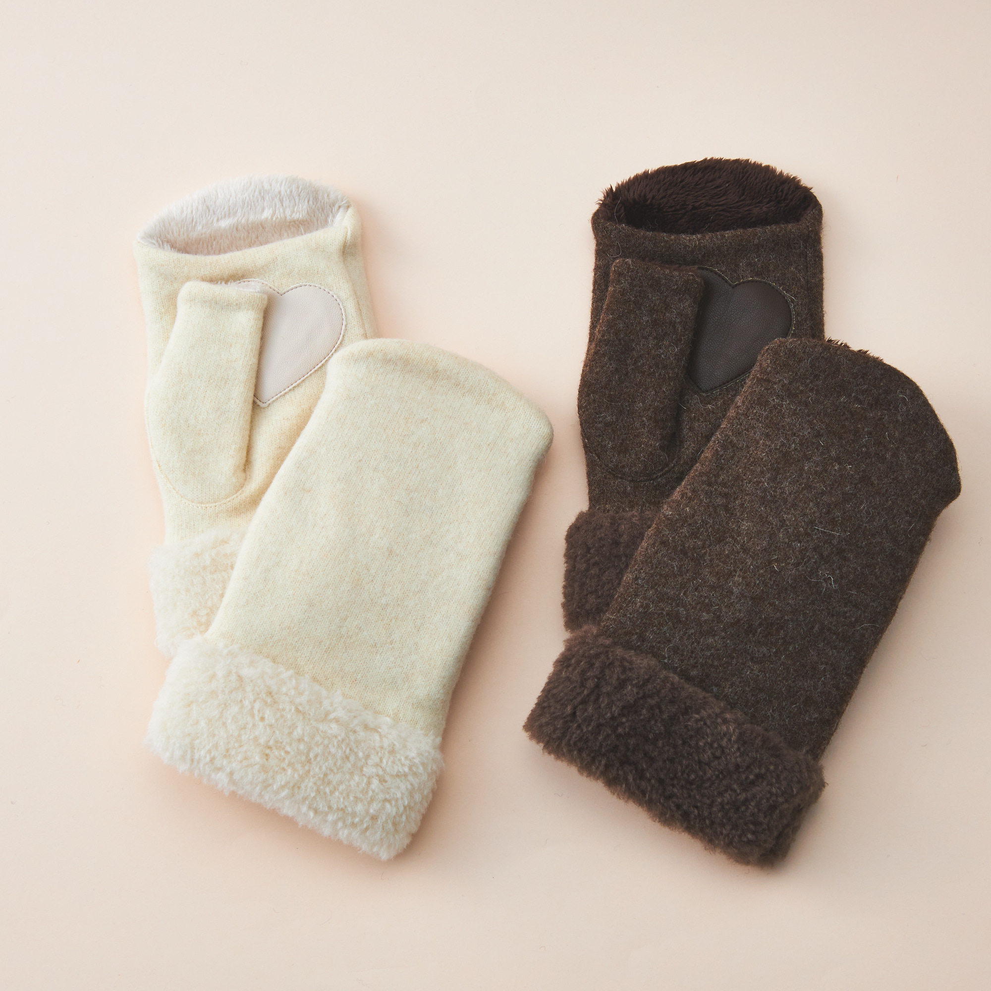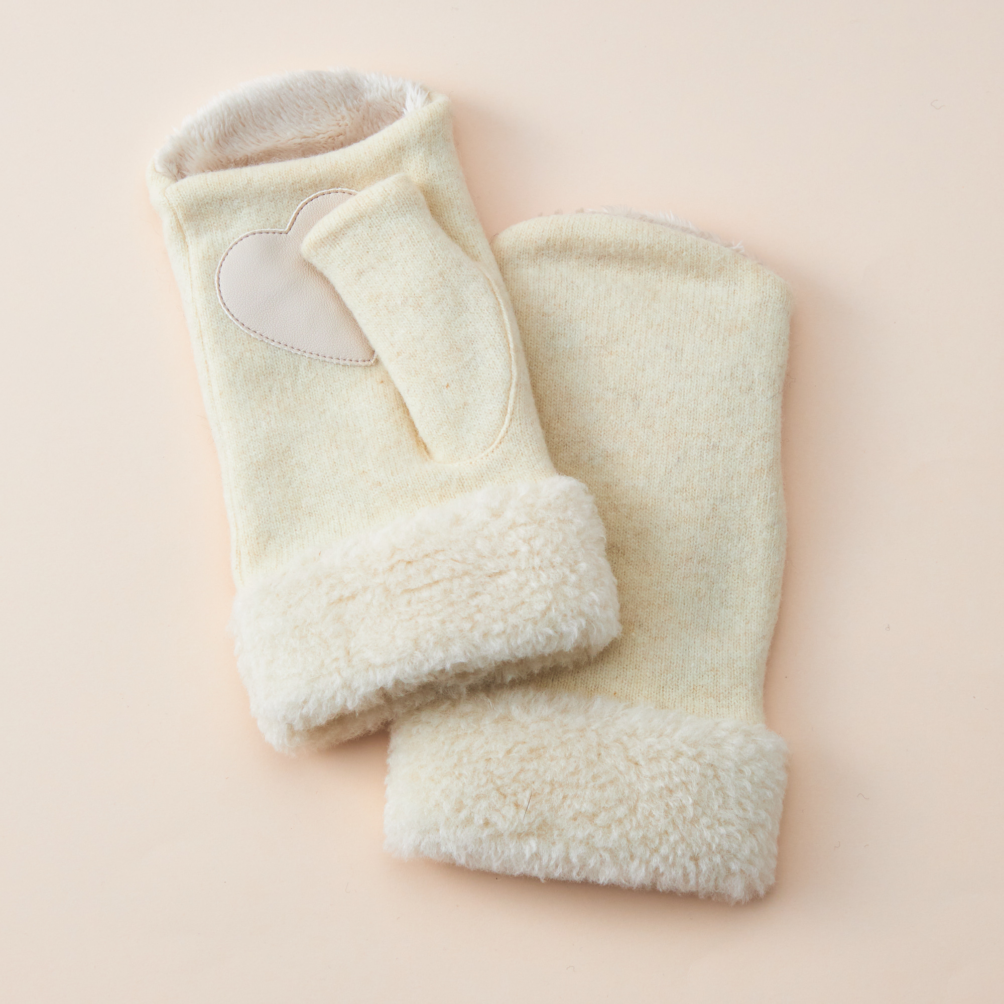 大口注文・法人のお問い合わせはこちらナチュラルで優しい色合いが特徴の手袋です。手の平部にはハート形の合皮が付いており、滑り止めの役割も果たします。