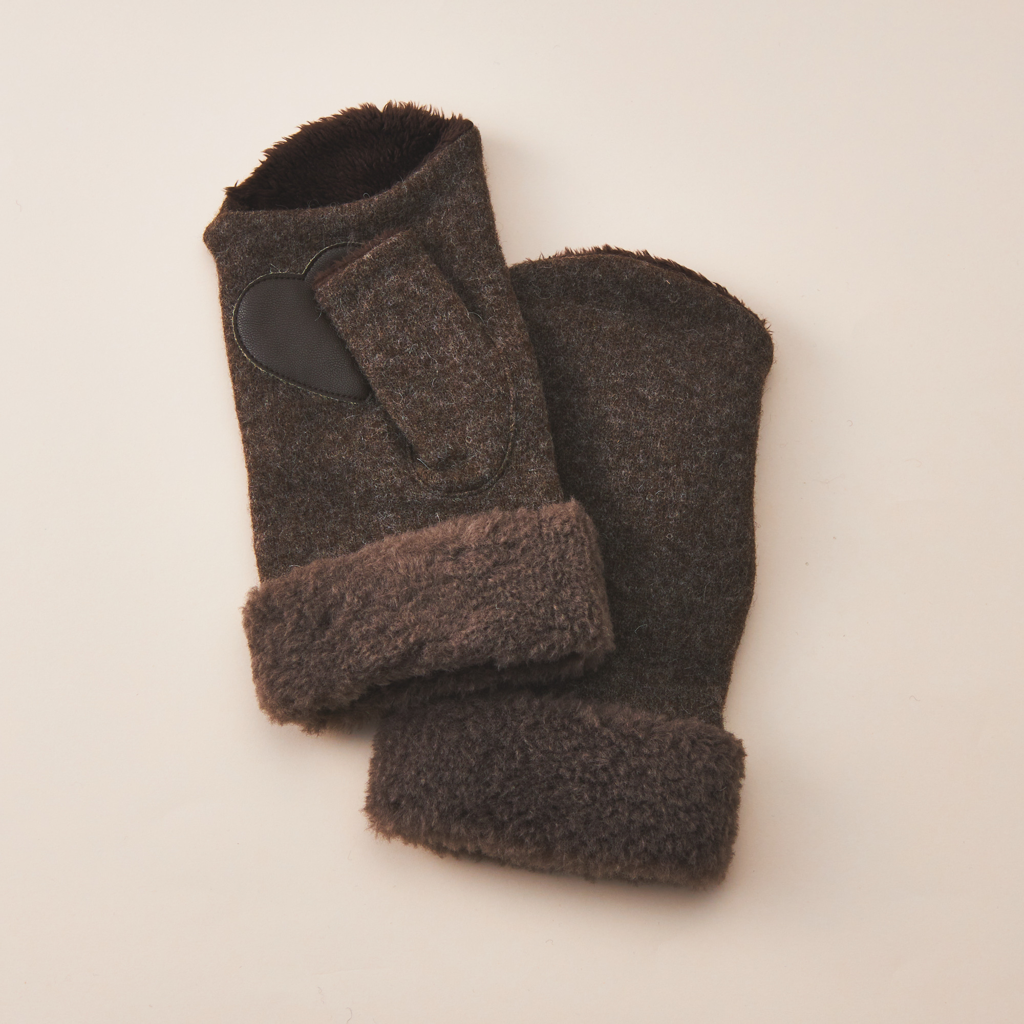 無染色ウールによる手袋です。ナチュラルで優しい色合いが特徴。手の平部にはハート形の合皮が付いており、滑り止めの役割も果たします。オフホワイトとモカの2色からお選びいただけます。大切な方への贈り物としてはもちろん、ご自分へのご褒美にもおすすめです。