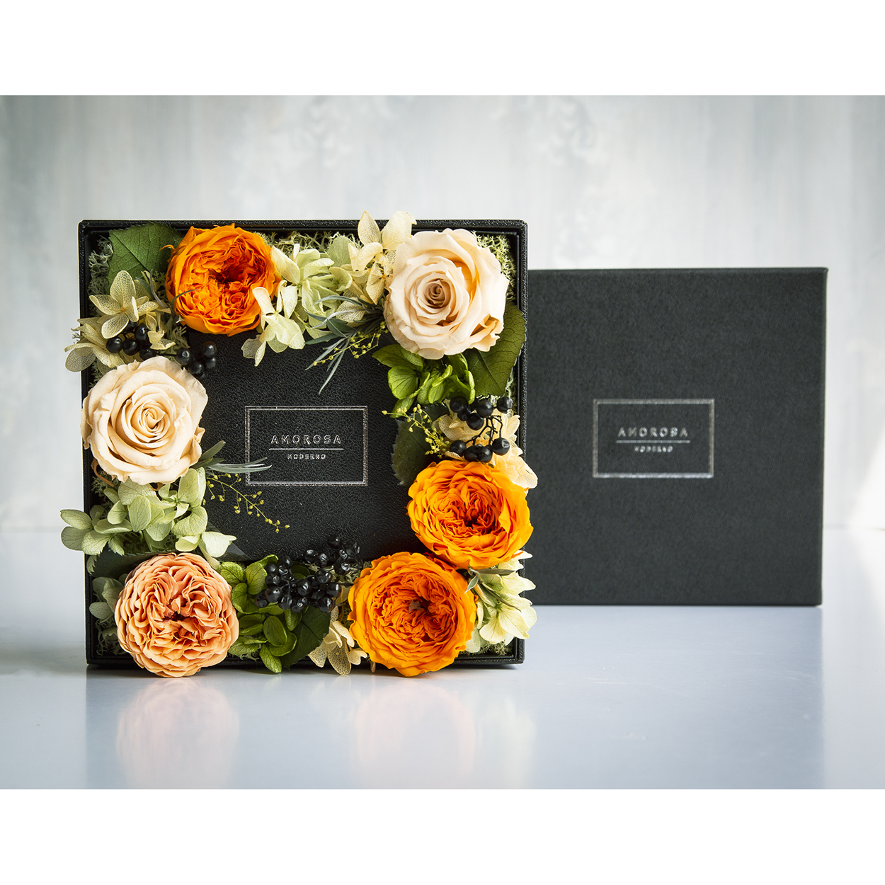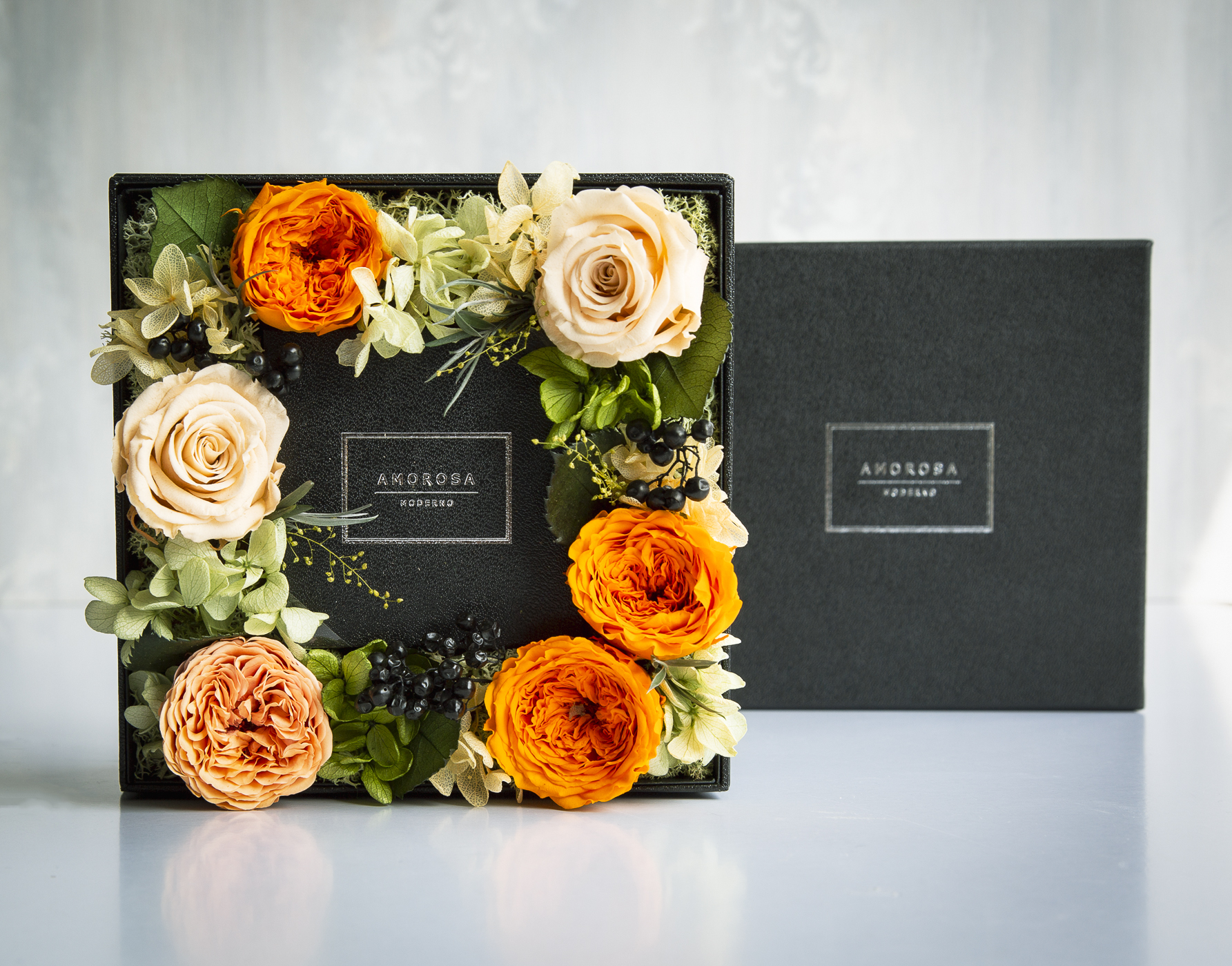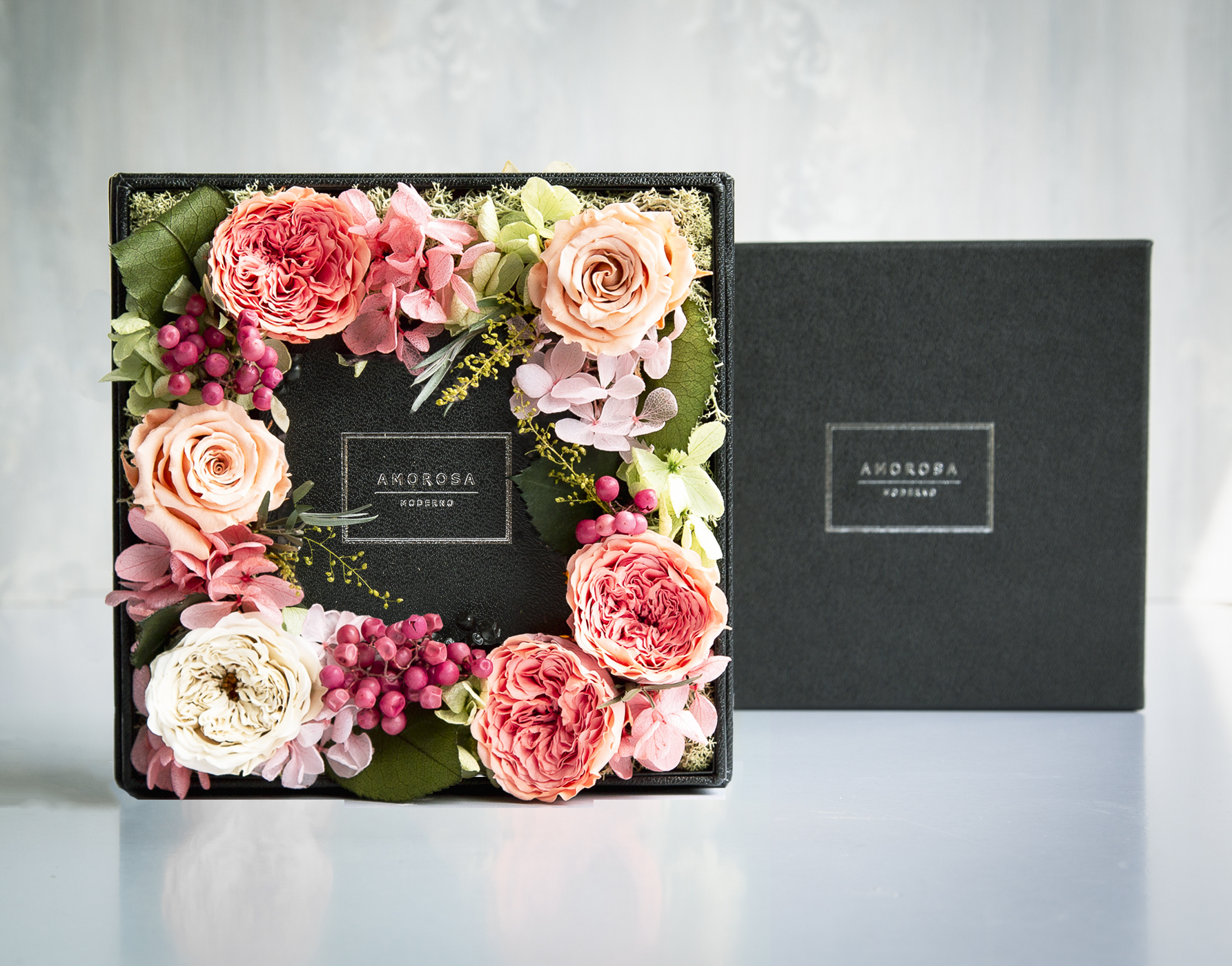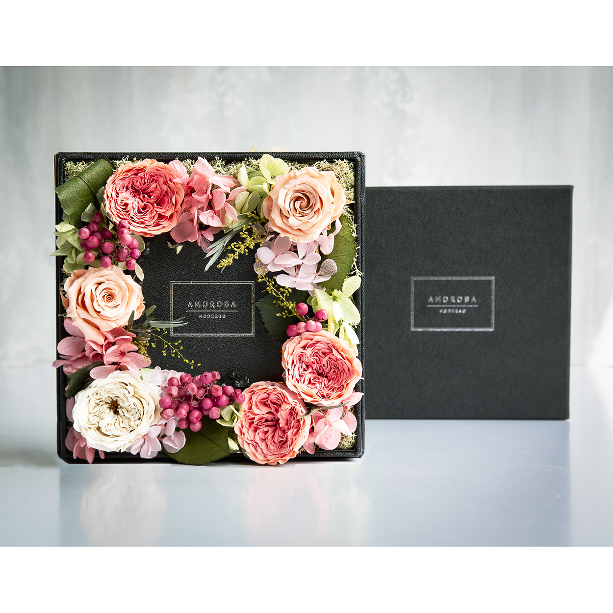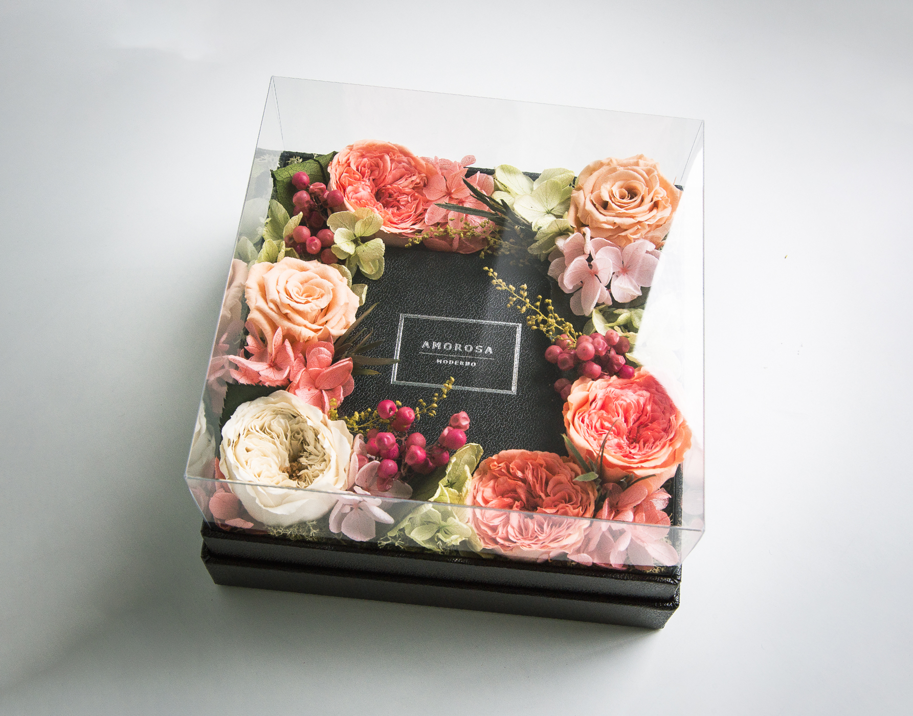 大口注文・法人のお問い合わせはこちら最高級プリザーブドローズ「AMOROSA(アモローサ)」のローズを使用したベルベットのような質感と光沢が魅力のプリザーブドフラワーです。中央にはお写真やカードなどを飾っていただけます。 AMOROSA MODERNOでは、フランス・パリ製の最高級ローズパフュームリボンを包装に使用しています。 ※白色シルバーロゴ印字のリボンに限る 到着した瞬間、上質なローズの香りが漂い、アイテムへの期待感を演出します。このリボンには生地にローズパフュームがマイクロカプセルで埋め込まれており、一年以上の長期にわたり、ローズの香りを放ち続けます。 ※香りが弱まった場合は、摩擦により復活します。