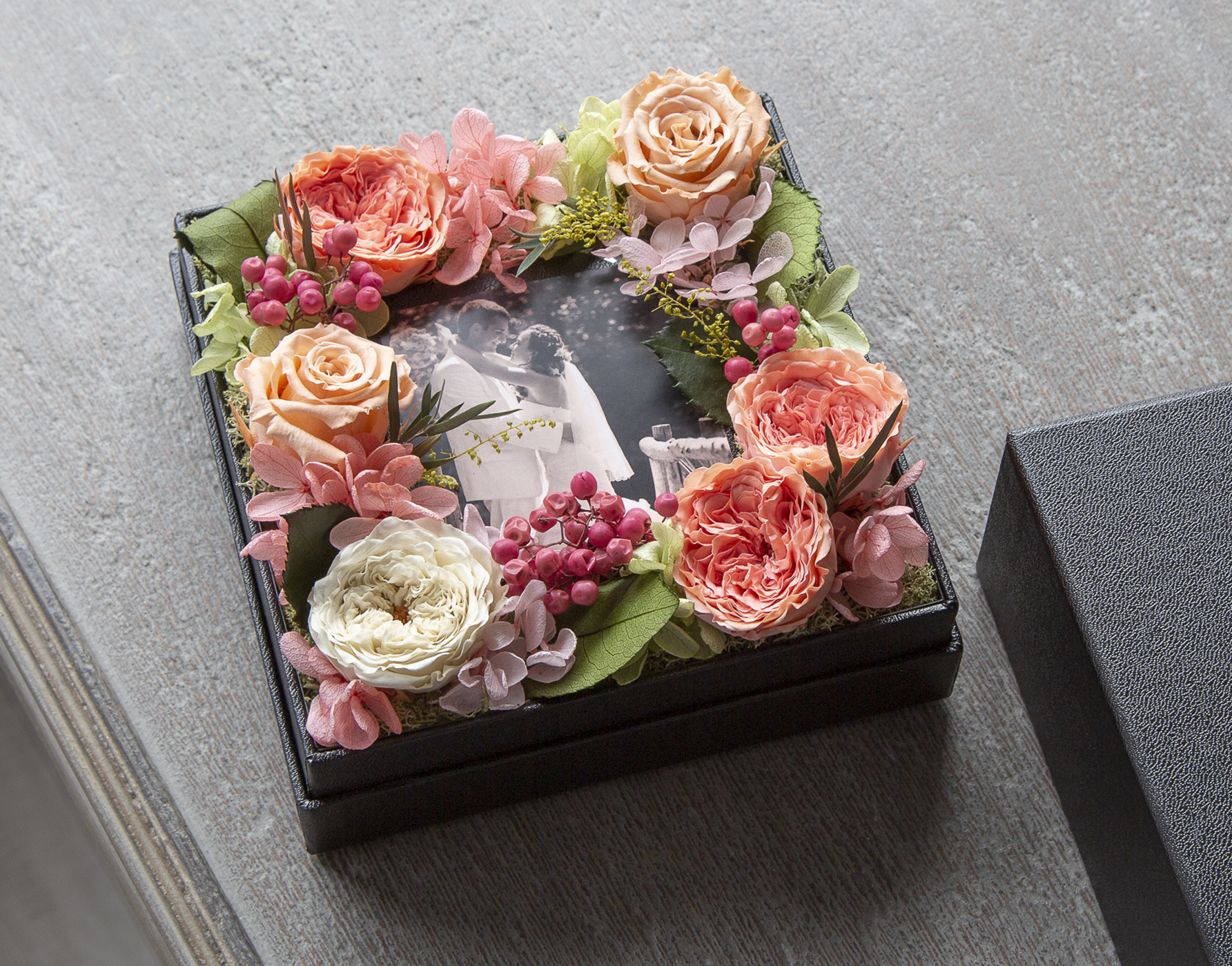 最高級プリザーブドローズ「AMOROSA(アモローサ)」のローズを使用したベルベットのような質感と光沢が魅力のプリザーブドフラワーです。中央には写真やカードがセットできる仕様になっているので、結婚式の両親への贈呈用ギフトや出産の内祝などにおすすめの商品です。