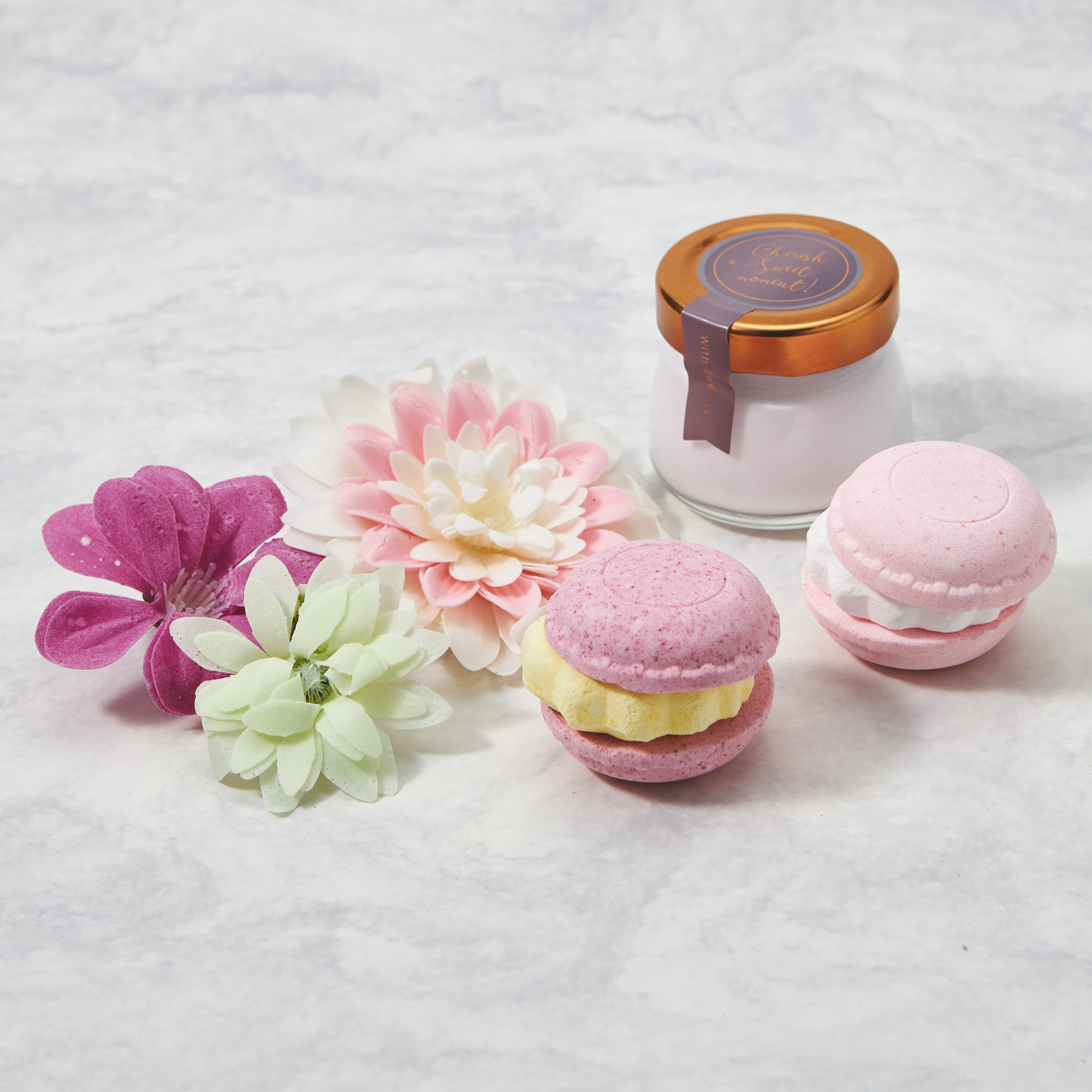 マカロンフィズ2個とフラワーバスペタルが合わさった華やかなバスギフトと、可愛い小瓶に入ったハンド&ネイルクリームのセットです。本物のスイーツのような可愛いデザインで、自分用にもギフト用にも、気分を上げてくれるアイテムです。
