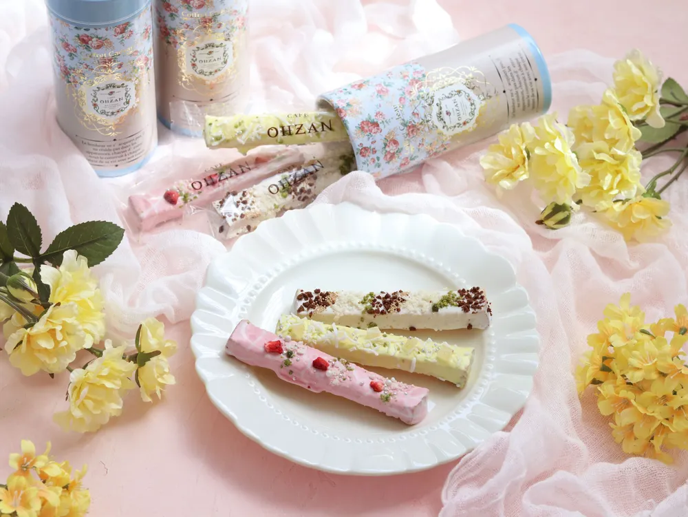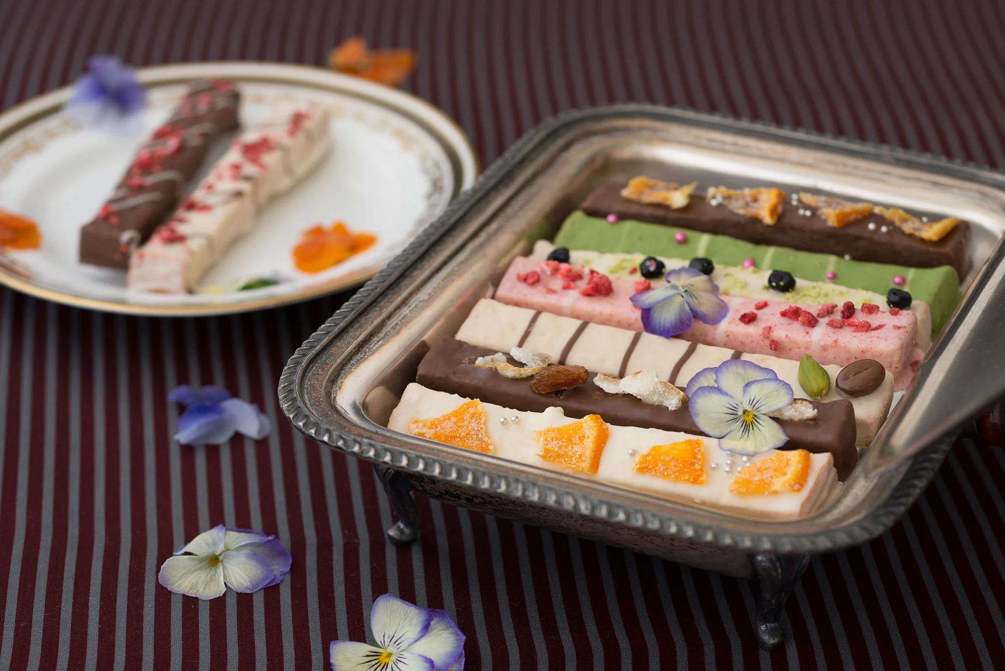 サクサクの食感に仕上げたスティックラスクです。チョコレートをたっぷりとコーティングしています。お花やドライフルーツ、ナッツなどでデコレーションされた、まるで宝石のようなスイーツです。