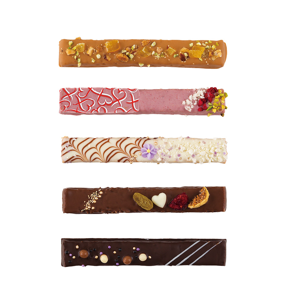 チョコラスクは全て異なるベースチョコレートでコーティング。 ミルクチョコレート、ビターチョコレート、ホワイトチョコレート、キャラメルチョコレート、ストロベリーチョコレートの5種類をお楽しみ頂けます。