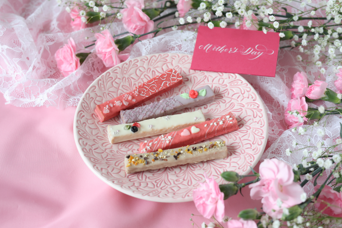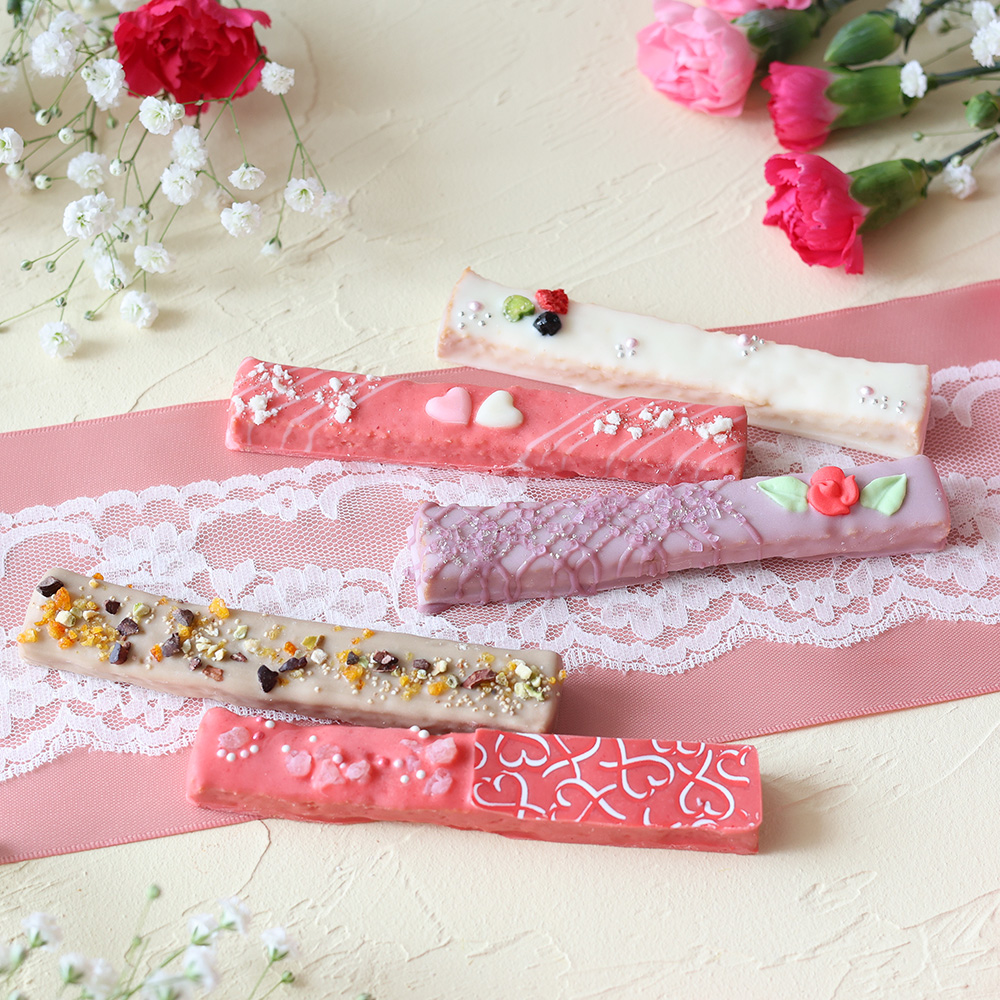 2025年母の日商品には、母の日を華やかに祝うラインナップにしています。 メレンゲでおつくりしたバラの花やバラ柄のデコレーションシートを使うことで、母の日ギフトを強調。 すべて今年限定のフレーバーをご用意しました。その中でも特徴的な2本をご紹介します。 〇上から3本目(ベースチョコ:ホワイトチョコレート) メレンゲでおつくりしたバラの花を添えて華やかさを演出しております。母の日のギフトとしてもピッタリな商品です。 〇上から5本目(ベースチョコ:紅茶チョコ) ダージリンティが香る限定フレーバーです。ドライオレンジやカカオニブ、ピスタチオをトッピングした1本です。