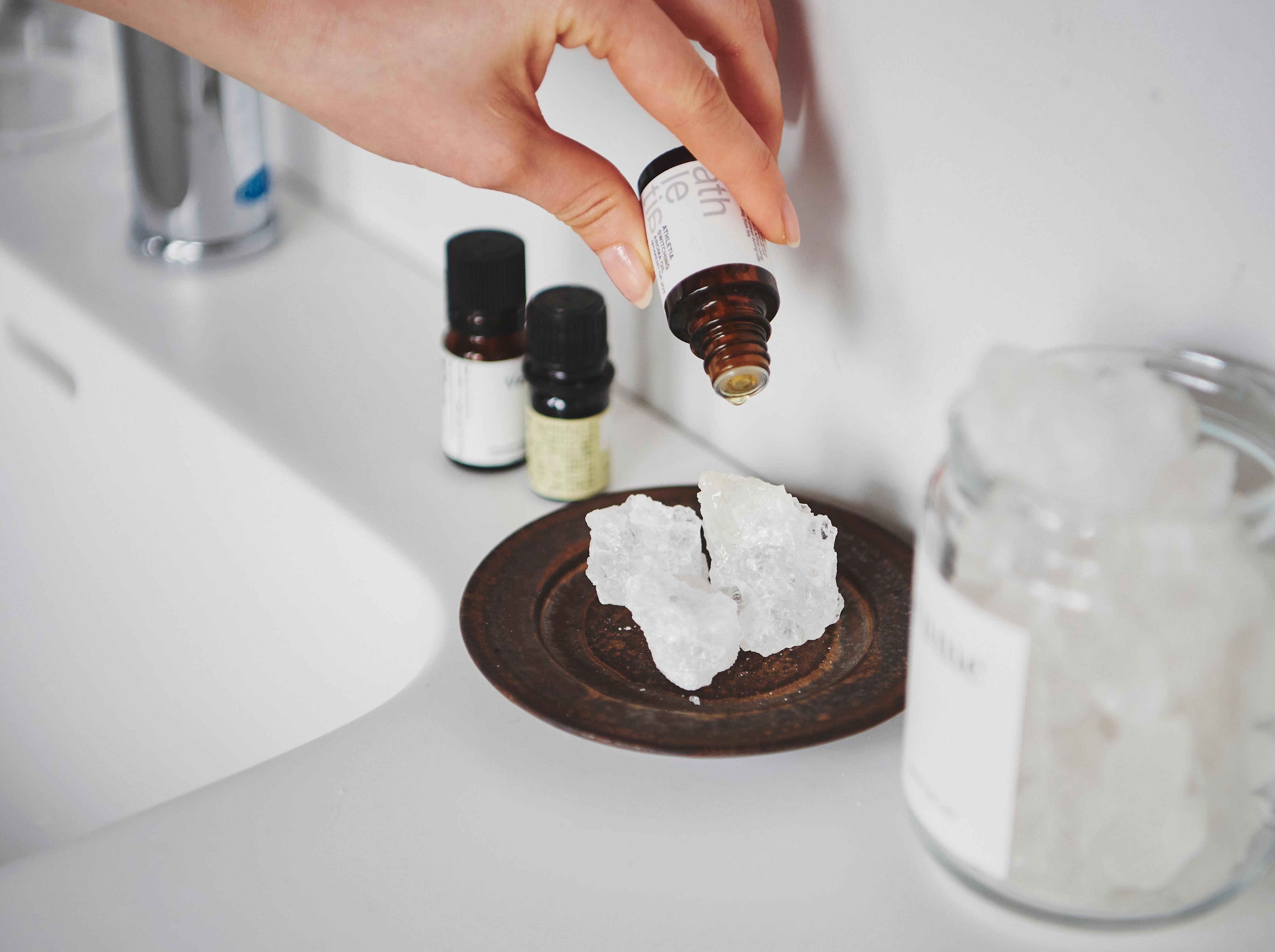 無臭のクリスタルやコーラルのバスソルトに、お好みのアロマを垂らし、インテリアとして楽しんだ後、お風呂に入れていただくことも可能です。