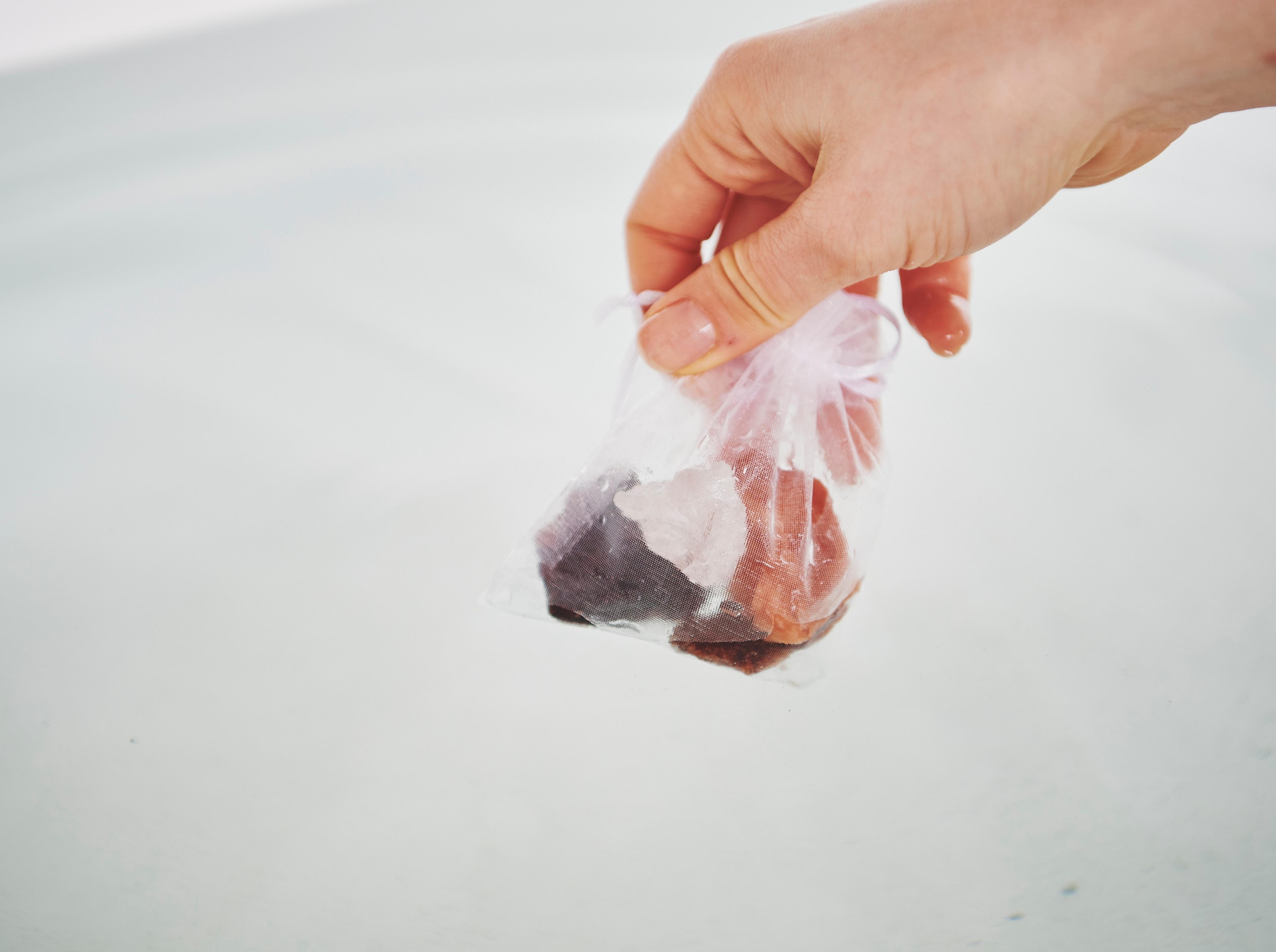 付属の小袋にお好きなバスソルトを適量(20g前後・1〜5個程度)入れて、お使いいただけます。バスソルトがお湯に溶けていく様子をお楽しみください。
