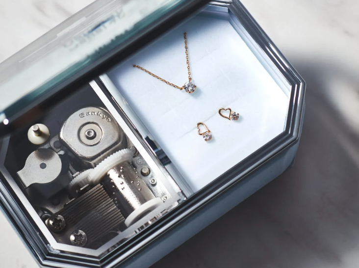 オルゴールジュエリーケースにジュエリーをセットしてお届けいたします。