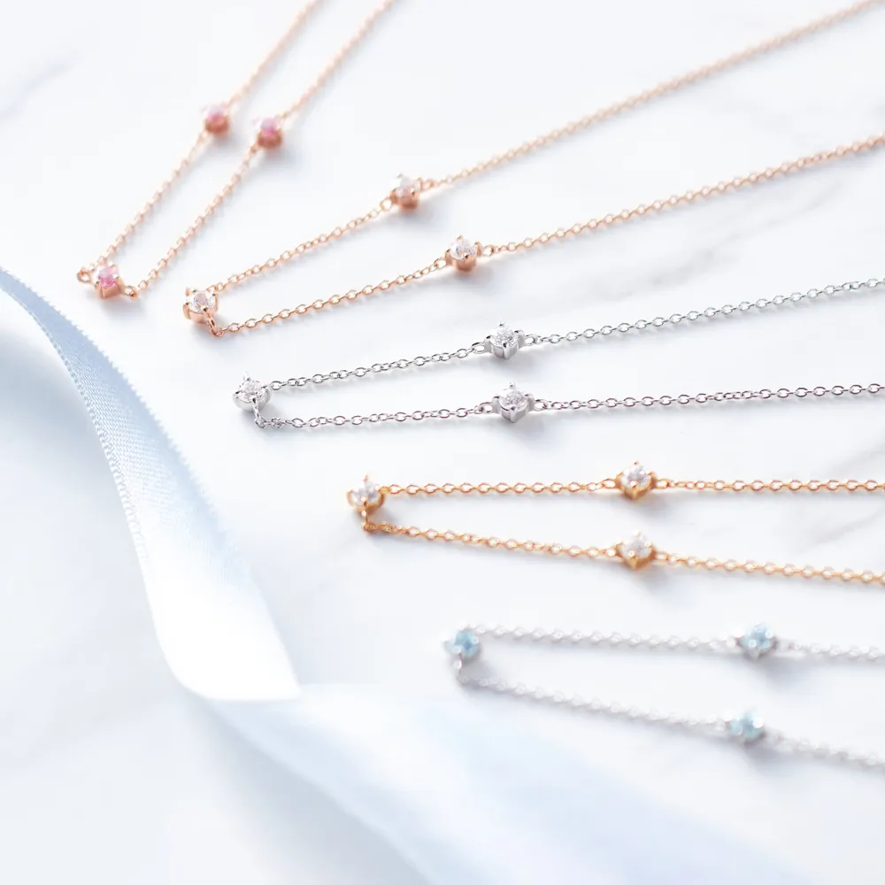 3石のキュービックジルコニアが寄り添うブレスレット。 シンプルながらも個性が光るデザインは、さり気なく普段のコーディネートにアクセントを添えてくれます。 ピンクゴールドコーティングの優しい色合いも魅力的で、日常使いしやすいカラーです。