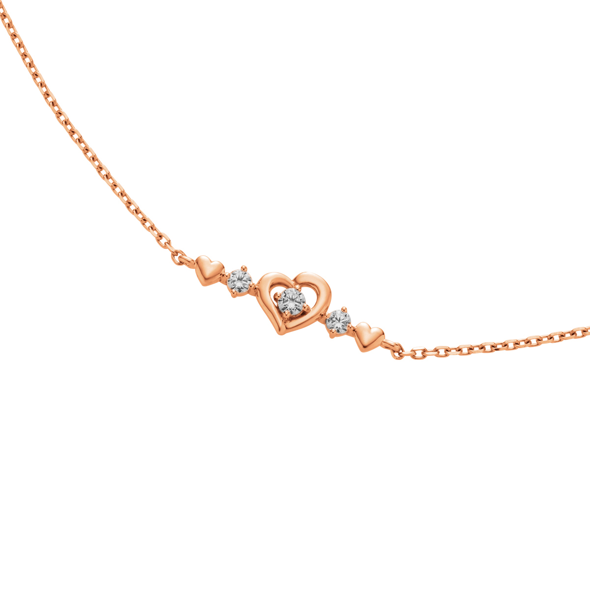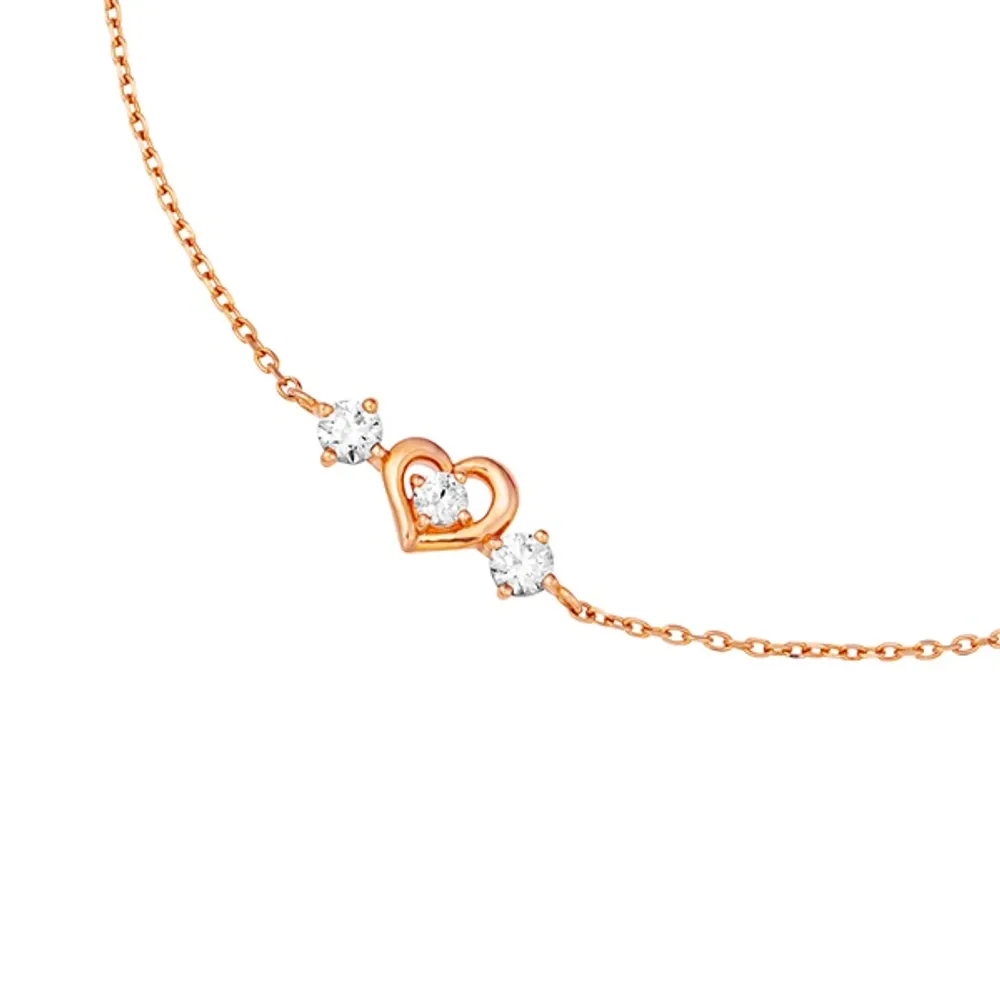 ハートモチーフの中央と両サイドにキュービックジルコニアがきらめくブレスレット。ピンクゴールドコーティングの優しい色と愛らしいハートがフェミニンな印象に。