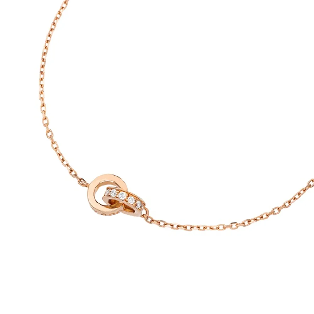 ふたつのサークルで恋人たちの絆を表現したブレスレット。片方のサークルに「now and forever = 今も、これからもずっと一緒に」というメッセージが刻まれています。ピンクゴールドコーティングの優しい色合いとキュービックジルコニアの輝きが女性らしさを引き立てます。
