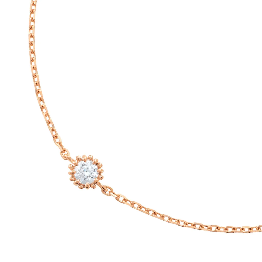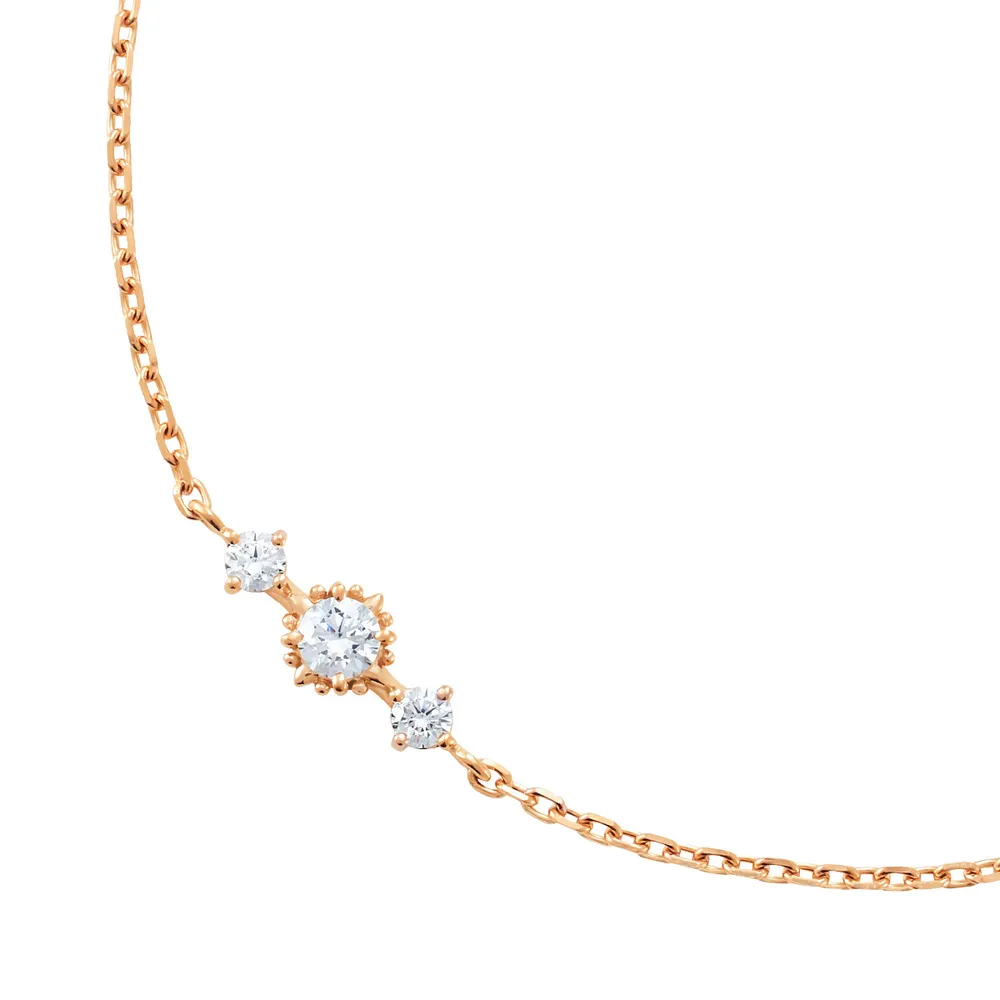 三粒のダイヤモンドと肌馴染みの良いピンクゴールドが女性らしい手元を演出してくれるブレスレット。シンプルなデザインは幅広い服装に合わせやすいのでプレゼントとしてもオススメです。 【店舗問い合わせ品番:151416133103】