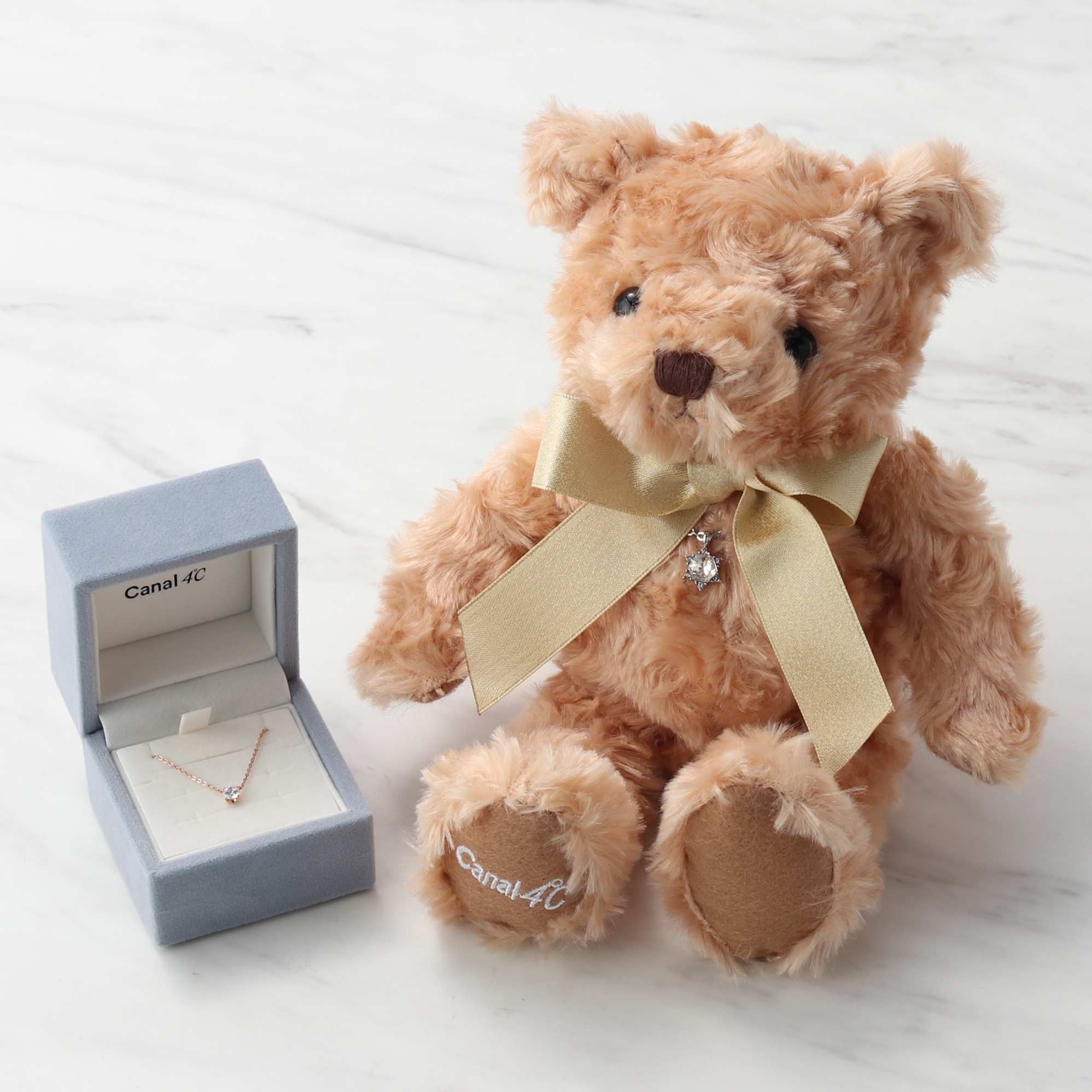 ジュエリーブランド「Canal 4℃」のタンプ限定セット。胸元で凛とした輝きを放つ、一粒タイプのネックレスはどのような装いにも合わせやすく、ギフトにおすすめアイテム。この冬限定デザインのオリジナルベアと一緒にお届けします。