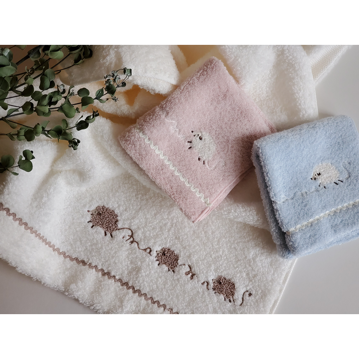 大口注文・法人のお問い合わせはこちら細い糸と無撚糸(撚りのない糸)を使用し、ボリューム感のあるふわふわの肌触りに仕上げました。波レースとひつじのふんわり刺繍がポイントです。 赤ちゃんの時だけでなく、ある程度大きくなってからもお風呂上りや水遊び後のお子さま用バスタオルとしてながくお使いいただけるので、出産祝いや子育て中のご家庭へのプレゼントにぴったりです。 ブルー、ピンク、アイボリーの3色からお選びいただけます。