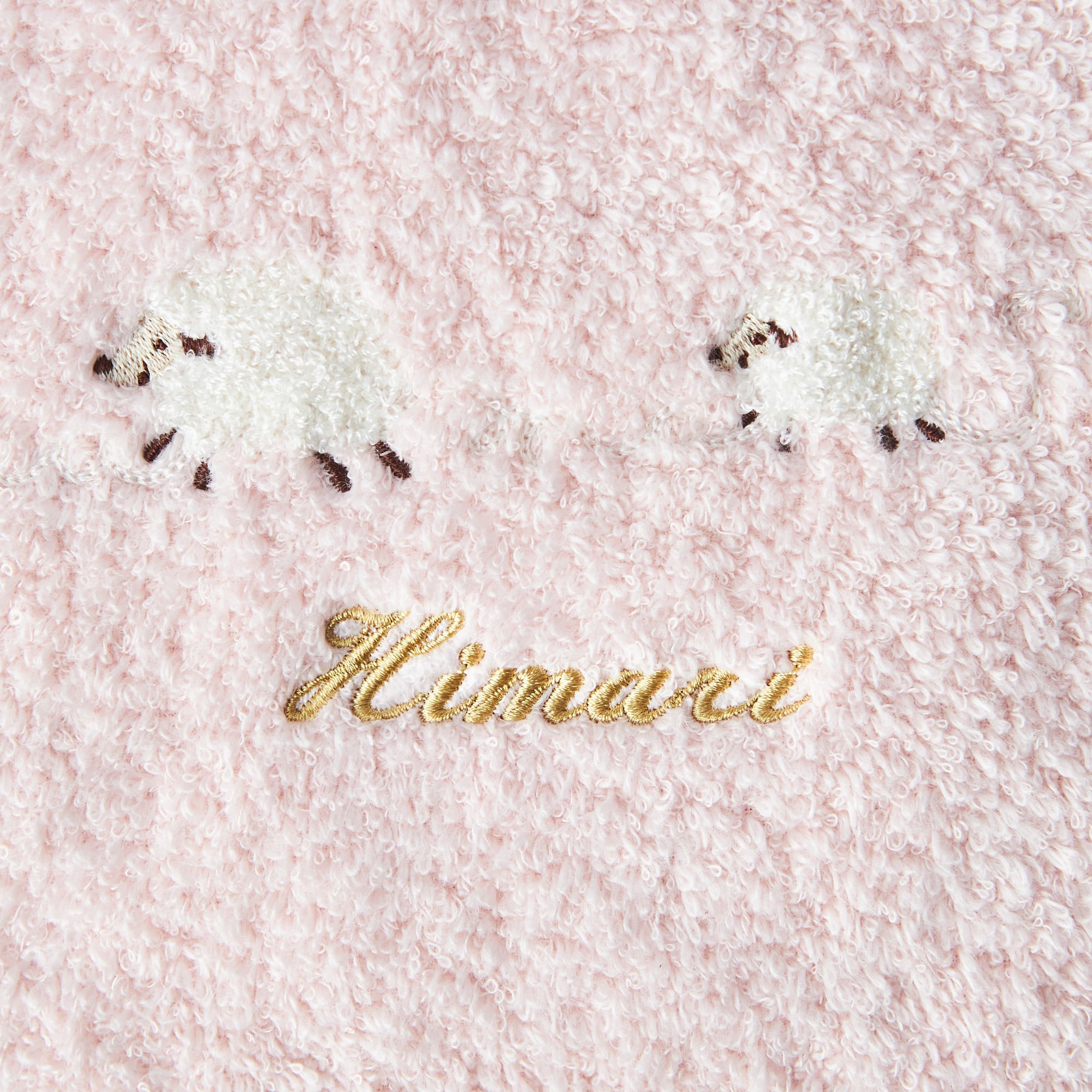 メレンゲのポイントはもう一つ。サガラ刺繍で表現した、もこもこのヒツジ。温かみがあって、見ているとホッとさせてくれ、ふわふわとやさしい肌あたりです。サガラ刺繍とは糸に針を引っかけて引き上げることでループを作ります。 立体感が出て、高級感もあることから洋服などにも多く使われる人気の技法です。