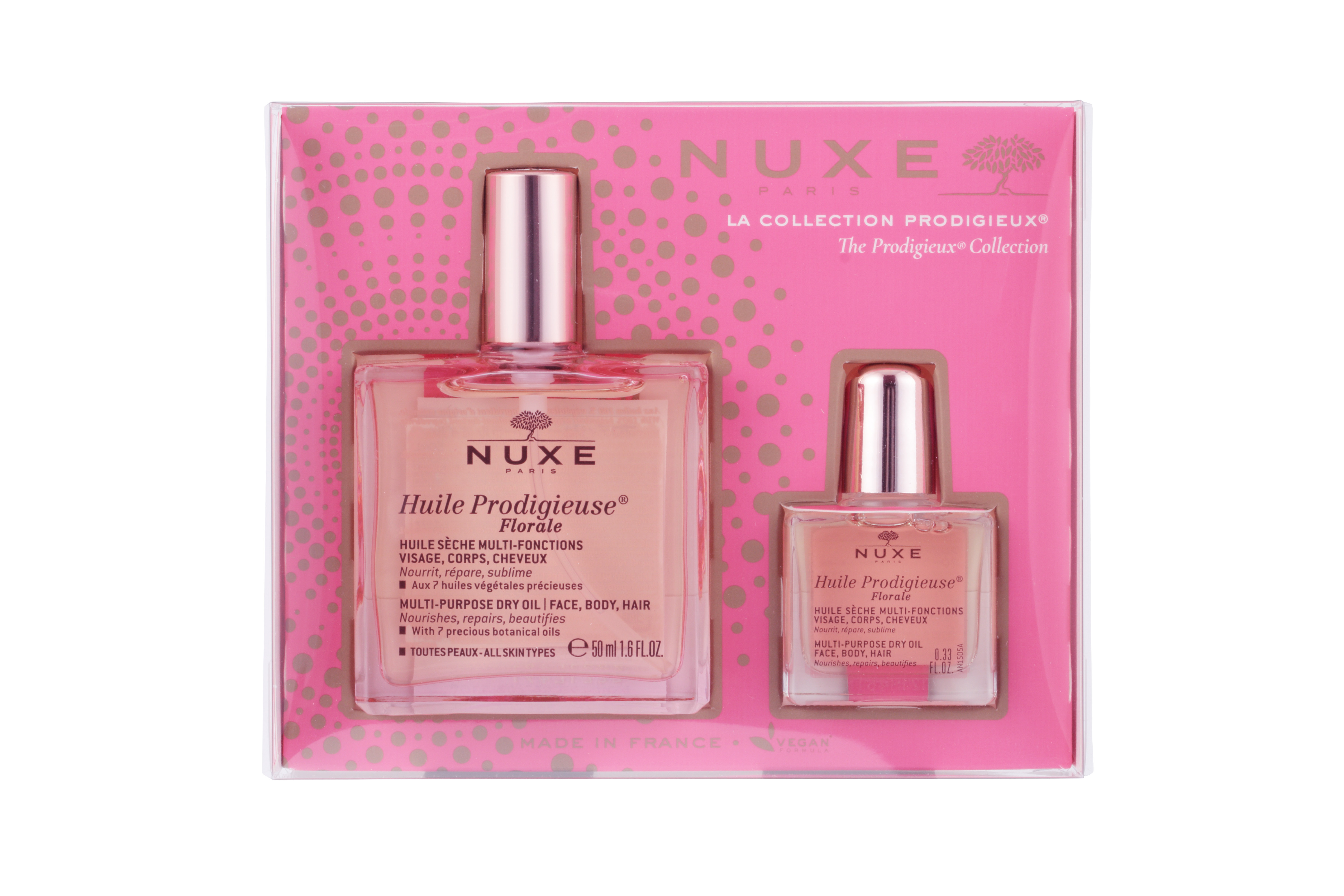 大口注文・法人のお問い合わせはこちら大人気のプロディジューフローラルオイル50mlにミニ付きのスペシャルセットが数量限定発売! シュッと片手で使え、サラッとべたつかず、フェイスはもちろんのこと、ボディや髪など全身に使え、現代女性のライフスタイルに溶け込み、望みを叶えるスキンケア。 なじませるほどに艶、潤い、ハリが生まれ、吸い付くようにしなやかになっていく肌質感です。 様々なギフト需要にもオススメのアイテムです!!