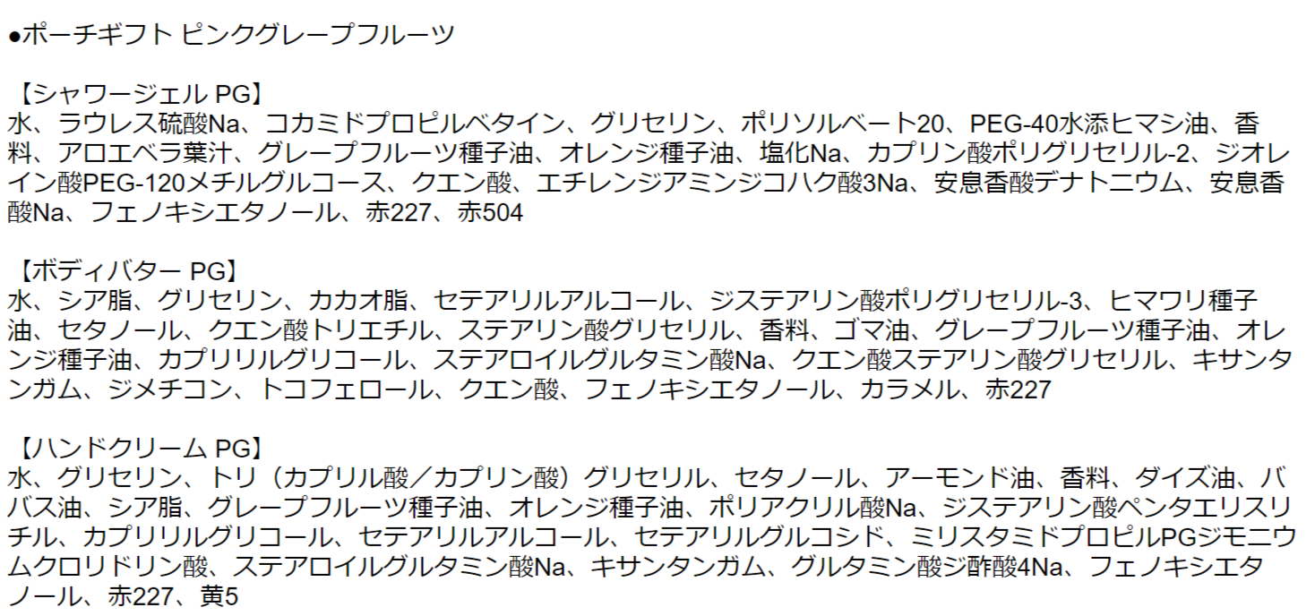 | お届け内容 | ・シャワージェル 60ml ・ボディバター 50ml ・ハンドクリーム 30ml ・オリジナルポーチ |