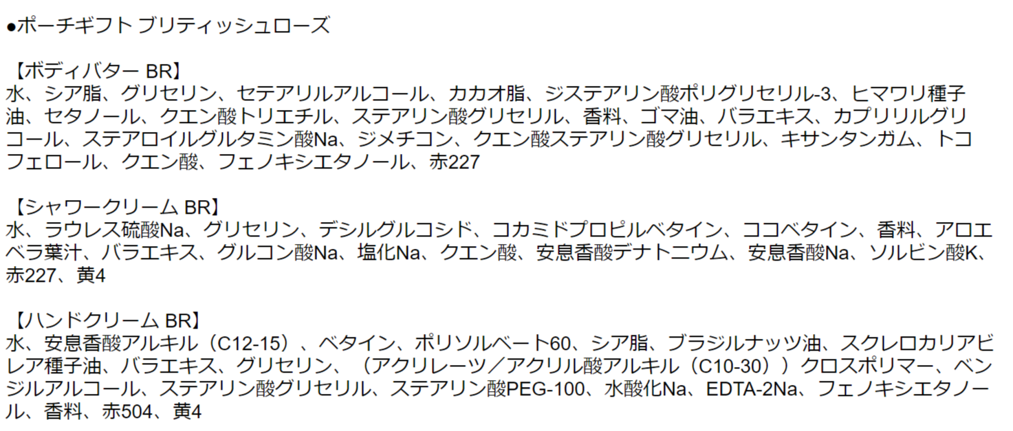 | 原産国 | 【シャワージェル】イギリス 【ボディバター】ポーランド 【ハンドクリーム】タイ |