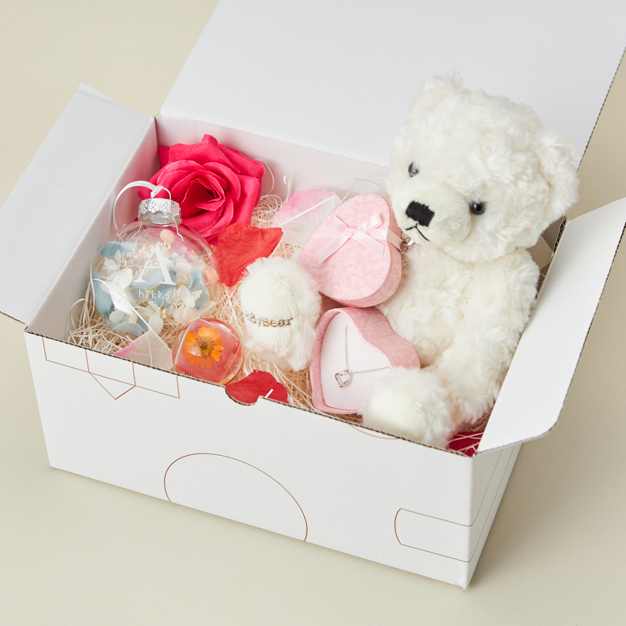 大口注文・法人のお問い合わせはこちらふわふわで可愛いテディベアのぬいぐるみと、誕生石をあしらったオープンハートモチーフのネックレス、ハワイ土産としても人気の高い【BLOSSOM】のリップグロス、美しいドライフラワーとプリザーブドフラワーをぎゅっと詰め込んだイニシャル付きフラワーオーナメントのセットです。 ※ ダンボール装飾(有料)はオプション画面よりご選択ください。 ※ 配送用ダンボールのデザインは、写真と異なる場合がございます。
