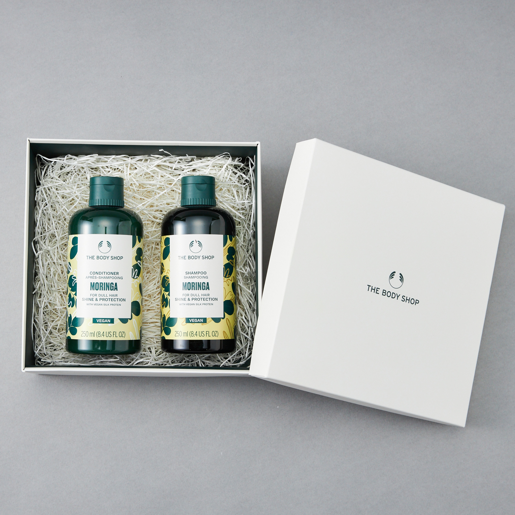 世界中に60カ国以上に3000店舗以上を展開する「THE BODY SHOP(ザボディショップ)」の、モリンガシャイン&プロテクトのシャンプー&コンディショナーです。モリンガシードエキスや毛髪補修成分ヴィーガンシルクプロテインがダメージ補修をしながら輝きのある髪へ導きます。専用BOXに入っているので贈り物にぴったりです。