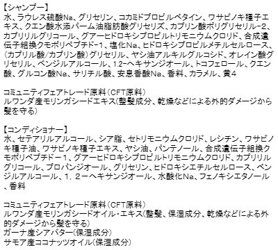 | 使用方法 | 【シャンプー】 頭皮と髪を十分に濡らしてから、少量のシャンプーを頭皮をマッサージするように髪の根元になじませ、髪全体をやさしく洗った後、丁寧にすすぎます。 【コンディショナー】 シャンプーの後、主に毛先に集中して塗布します。2~3分放置した後、十分にすすぎます。 |